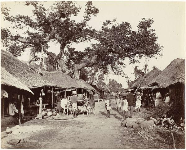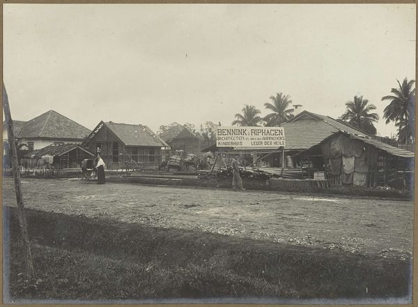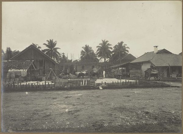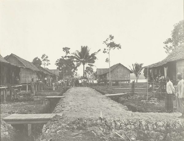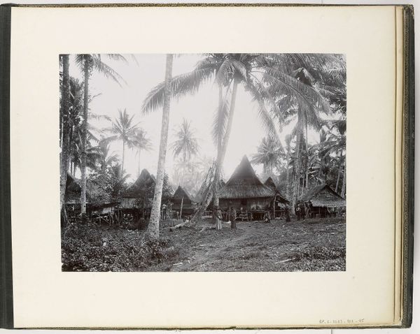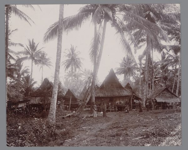 This photograph, "Kamp van werklieden aan Lawaspoorlijn," was taken by Jacob Evert Wesenhagen. It gives us a glimpse into a work camp, probably sometime in the late 19th or early 20th century. The image is mostly grayscale, with a high contrast in the textures. Look at the rough, thatched roofs of the huts against the smooth, bare hillside in the foreground. It's like the artist is really focused on the process of building and clearing the land, the raw, earthy feel of it all. I'm drawn to the way the light catches the huts. The rough texture and the light make it feel almost alive. Wesenhagen captured a real sense of place and work, but also kind of hints at the human presence, these tiny figures working in the distance. It reminds me a bit of some of the landscape work by someone like Gustave Courbet, capturing something real and raw. Art really is an ongoing conversation, each artist speaking to the world around them in their own way.