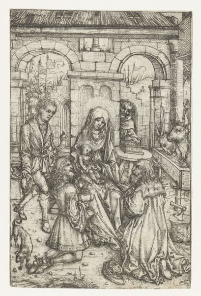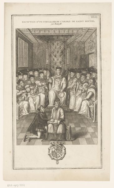 Editor: This engraving, titled "Portret van adellijk gezelschap waaronder Pierre Le Baud," is estimated to be from 1729-1733. I'm struck by the almost caricatured presentation of the figures. What social dynamics do you think it might be trying to capture? Curator: It's intriguing, isn't it? Beyond just a "portrait," this image provides insight into the performance of nobility. Look closely – consider how the artist uses visual cues to denote status, and also, perhaps, to critique it. Editor: I see what you mean! The architectural setting is grand, but some of the figures seem a bit…awkward, maybe? Curator: Exactly! Think about how societal power structures might be subverted or questioned within what seems like a straightforward representation of an aristocratic gathering. The deliberate placement of each figure, their gestures, even the architecture around them, could be seen as commenting on their roles and the overall artifice of courtly life. Editor: So it's not just about depicting nobility, but possibly about examining its inherent contradictions? Is it pushing against the existing power structures? Curator: Precisely. This piece might engage with Enlightenment ideals of reason and critiques of aristocratic privilege emerging during that period. It encourages us to examine art’s potential to document *and* question social order, reflecting growing socio-political tensions within this time frame. It's an artifact that makes us reflect upon representation itself. What is truth and what is a performance in identity? Editor: Wow, that’s a perspective I hadn't considered. I was so focused on the details, but seeing it in terms of social critique really opens up a whole new understanding of the work. Thank you! Curator: My pleasure. Art offers reflections of, and resistance to, the worlds it inhabits, revealing complex dynamics that echo throughout time.