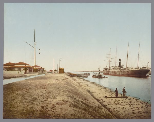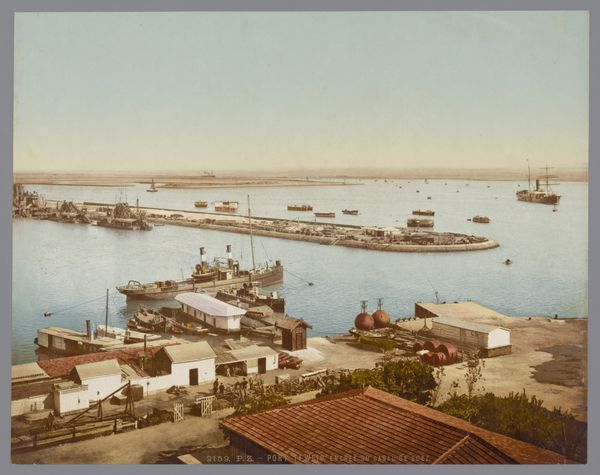 Curator: This captivating vista presents "Gezicht op de oostkust van Helgoland," or "View of the East Coast of Helgoland," dating roughly from 1889 to 1920. The artwork is currently housed here at the Rijksmuseum. Editor: Ah, the coast! It almost feels like a half-remembered dream. I get a definite seaside, summery feeling – very peaceful. But it also feels like it could tip over into melancholic, doesn't it? Those houses on the horizon, are they receding, or advancing? Curator: Indeed. There’s an interesting tension, isn't there? The mixed media approach – a tinted photograph likely finished with watercolor and colored pencil – grants the scene a hazy, almost unreal quality. The artist, whose name sadly hasn't survived to the present, really seemed interested in muting the specifics in favor of the atmosphere. I think the historical context gives it particular resonance when viewed through a postcolonial lens – Heligoland’s role as a strategic island changing hands through treaties resonates in how its image shifts and transforms over time through different renderings, photographic, painterly or otherwise. Editor: You know, that makes me think of a postcard. I can imagine someone sending this back home during wartime. There's something oddly flattened about the space. What does it *mean* to capture a view? Are we seeing Heligoland, or an idea of Heligoland? Curator: Exactly. We need to ask *who* is granted the license to define 'Heligoland', and on *whose* terms this ‘view’ is rendered and circulated? And this particular artist’s method - layering on and blurring media - becomes politically significant. The way impressionistic landscapes gained prominence at a time when industrialisation and imperialism were fundamentally reshaping the map feels far from accidental. Editor: Well put! Looking closer, I find a sense of anticipation—those boats resting idly in the water… it suggests things could, or will, soon happen. The entire town could suddenly be awakened and activated into something other than this idyllic snapshot. Or maybe that’s just my imagination running away with me! Curator: I think it’s a valuable reading – one where we see not only the artistic choices at play, but also a deeper, geopolitical subtext shaping what can or cannot be shown in an image. Editor: Absolutely. I’ll carry that reading with me. Thanks for untangling what might have been easy to take for granted in this gentle harbor view.
