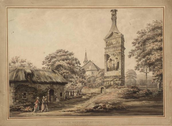 Editor: This watercolor and ink drawing, titled "Vrolijke partij in het dorp Houten" or "Merry Company in the Village of Houten", is by Jan de Beijer and dates from sometime between 1713 and 1780. It captures a scene that feels both idyllic and meticulously constructed. I am intrigued by the social dynamic being captured. How do you interpret this work in terms of its representation of Dutch society at that time? Curator: De Beijer’s work, though seemingly a simple cityscape, offers a glimpse into the power structures embedded within 18th-century Dutch society. We should ask ourselves who is included and who is excluded. Do we see, for instance, an accurate portrayal of class divisions? How does the architecture—the church tower looming over the scene, the grand house contrasted with the more modest structures—reinforce or challenge those divisions? Editor: That's a really interesting way to look at it! I hadn't considered the church's positioning in that way. Is the "Merry Company" then meant to suggest something more critical about the distribution of wealth and leisure? Curator: Perhaps. De Beijer presents us with a curated snapshot. Consider the title: is it genuinely "merry," or does it mask underlying tensions and inequalities? Are we meant to admire the scene, or question the conditions that make such leisure possible for some, while others remain unseen, working on farms and elsewhere? Whose narrative is truly being represented here? Editor: So, instead of simply appreciating the artistic skill and the quaintness of the scene, we should consider its implications about the people, or even the silences surrounding the people of the era, that the piece presents? Curator: Exactly. And how the gaze of the artist—presumably belonging to a certain class—shapes that representation. Engaging with these silences is key to understanding the art’s role in reinforcing, or potentially subverting, societal norms of the time. Editor: This really shifts how I view historical artworks. I'll definitely remember to look for those social commentaries in the future. Thanks! Curator: My pleasure. Remember, art is rarely neutral. It's always speaking from a specific context, consciously or unconsciously.