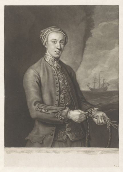 Editor: This is a print called "Portret van William Kerr," created sometime between 1762 and 1769 by Edward Fisher. I'm struck by its neoclassical formality, almost like a stage play. What captures your attention when you look at this engraving? Curator: Oh, the drama, absolutely! The controlled pose, the theatrical lighting, it whispers stories, doesn't it? For me, it's the *tension* between the sitter's apparent ease – that almost nonchalant lean against what looks like a rocky outcrop – and the very *real* instrument of war he’s holding. Notice how that gleaming spear-like bayonet mirrors his upright stance. It begs the question: serenity or readiness? What do you reckon? Editor: That’s a fantastic point! I was so focused on the composition I didn't really think about the contrasting emotions. It seems almost like a romanticized view of conflict. But why depict a soldier this way? Curator: Ah, the 18th century! Think "enlightened ideals" meeting "colonial ambitions." This wasn't *just* a portrait; it was carefully constructed propaganda, presenting William Kerr not merely as a soldier, but as a refined gentleman performing his patriotic duty. A hero, yes, but a civilised one! Almost airbrushed, really. Do you find that rings true? Editor: Definitely! Knowing that adds a whole new layer. I initially saw only the artistic elements. Now, I see the carefully crafted message, too. Curator: Exactly! And isn't that the joy of art? One starts with the aesthetic, but a little context and the piece suddenly blossoms with significance. This piece, far from being a simple likeness, offers a tantalising glimpse into the political and cultural theatre of the 18th century. What a story this print now tells! Editor: I agree; I’ll never look at an 18th-century portrait the same way again. Thanks for the insight!