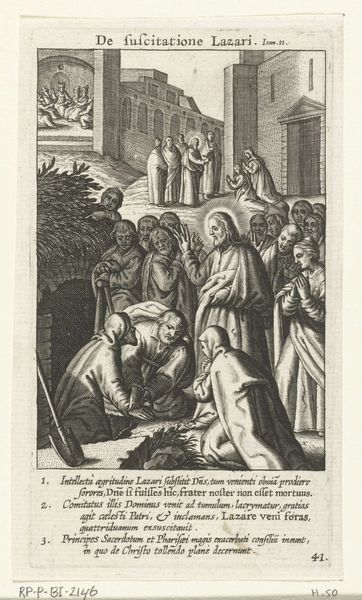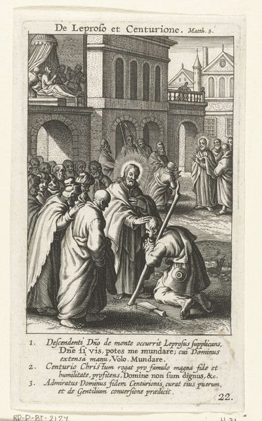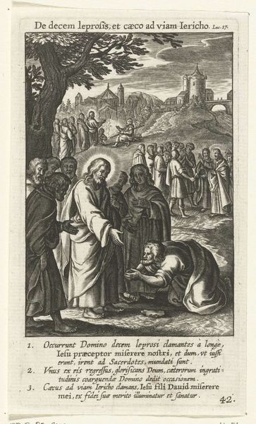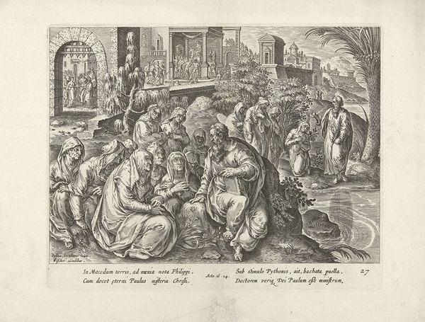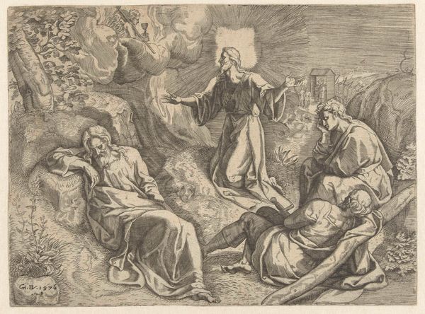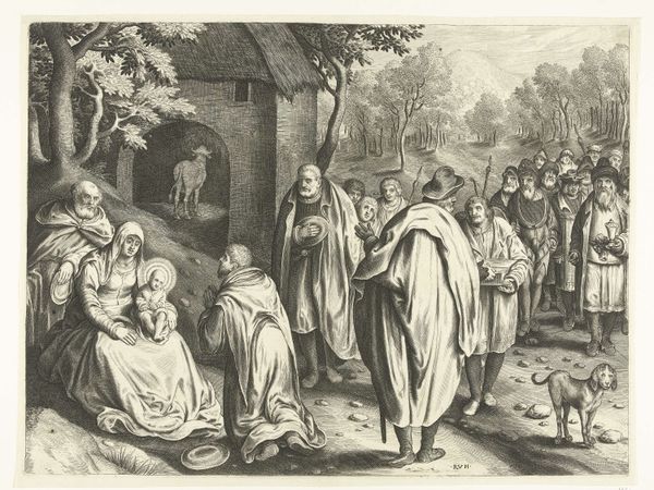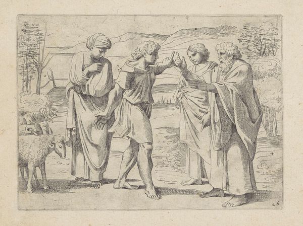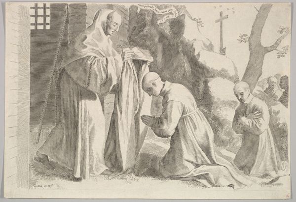 Editor: Here we have Jan Barentsz. Muyckens' engraving, "Abraham verwelkomt de drie engelen," from 1637. It depicts Abraham kneeling before three figures in robes. There’s a stark contrast between the light figures and the dark landscape on the left, making them appear otherworldly. What stands out to you most when you look at this print? Curator: I'm struck by how this scene, rooted in religious narrative, becomes a platform for exploring themes of hospitality and divine intervention, and, critically, their intersection with power dynamics. Consider Abraham's posture – kneeling, submissive. Muyckens uses the visual language of hierarchy. How might this relate to the social hierarchies of 17th century Netherlands? Editor: I see your point. His posture indicates he is in an inferior position compared to the angels. But where is the disruption? Curator: Think about the economic and political landscape of the time. The Dutch Republic was burgeoning with mercantile power, built, in part, on global trade and, unfortunately, colonization. Abraham's welcome could also be interpreted as the negotiated welcome that early colonizers gave inhabitants they would have colonized, but presented with an apparent agreement to share power. What kind of agreements can colonization come with and who are the people benefitting from such agreements? Editor: So you're saying the image can be a commentary on power relations disguised as religious reverence? Curator: Precisely. It invites us to question the narrative and identify hidden inequalities and the potential for a coersive and imbalanced agreement between colonizer and indigine. We must consider whose stories are being prioritized, whose voices are being amplified, and who benefits most from these so-called divine interactions. Editor: This gives me so much to think about. It shows me how crucial it is to investigate social structure in the background of artwork and how important context is. Curator: It's about peeling back the layers to reveal the socio-political fabric woven into even seemingly straightforward religious depictions. Hopefully viewers feel called to disrupt power imbalances they can see.