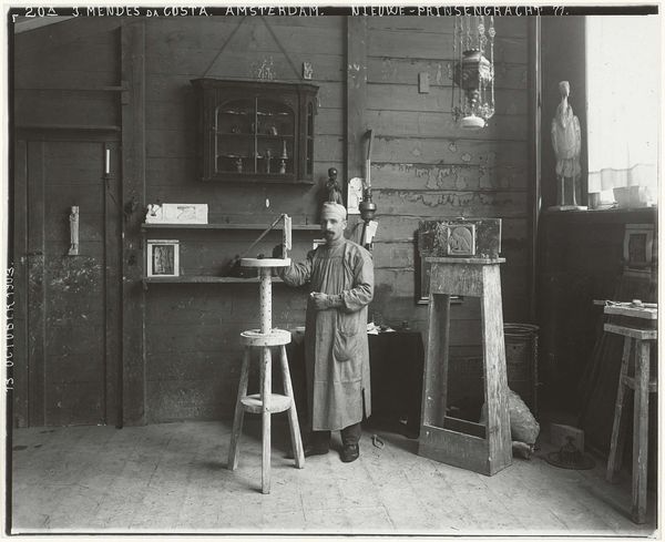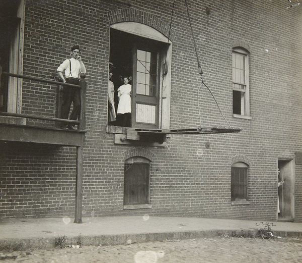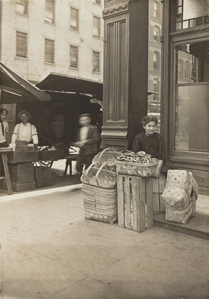 Curator: This is a gelatin silver print by Lewis Hine, taken around 1914. It's titled "Wagon boy or \"tail boy\" helping to load the wagon." Editor: My initial impression? Stark vulnerability, isn't it? That weight he carries is far more than just those boxes. There’s a silent story etched onto his young face. Curator: Indeed. The composition reinforces that. Hine's careful framing—the boy centered, yet dwarfed by the building—creates a visual tension. His slightly tilted posture emphasizes the burden, not just of the boxes, but the social weight he bears as a child laborer. The photograph functions as a visual argument. Editor: You’re so right. It's not merely documentary; it’s an outcry! I can almost feel the gritty city air. What really grips me is the way his eyes lock with the camera, almost challenging us to truly see his situation. It feels less like observation and more like shared moment of reckoning. It evokes Dorothea Lange’s depression era photography for sure. Curator: The tones further augment this, progressing smoothly, with sharp contrasts enhancing textural elements: the rough brickwork, the boy's worn clothing, and the fragility of those stacked boxes. It is both immediate in its realness and timeless. The depth of field forces attention upon the very visible weight he bears. Editor: It’s incredible that Hine could distill such humanity from something as seemingly mundane as a delivery. You sense there is pride mixed with a weary acknowledgement. The tilt of his hat almost hints at a rebellious spirit against those overwhelming circumstances! You just know there’s poetry lurking in his world if only… Curator: His contributions undoubtedly reshaped perceptions about social injustice. "Wagon boy" is potent iconography; it's a meticulous construct meant to incite change through pure documentation—social reform art, in essence. Editor: Precisely! It invites conversation. It’s so potent I almost feel changed for having seen it…It's those lingering gazes, and their challenge that imprints itself so profoundly. It makes me grateful to have stopped and stared today.