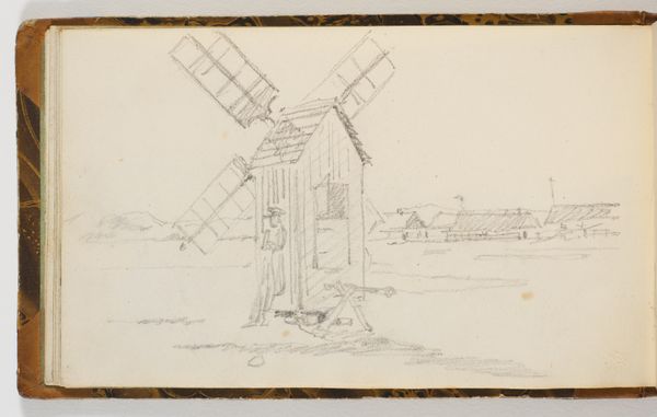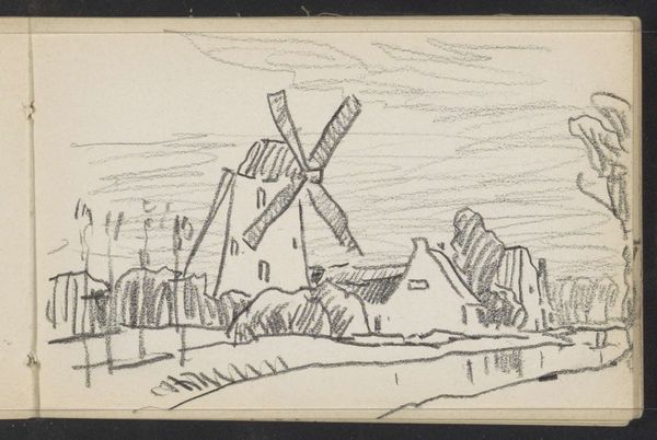 Georges Michel created this sketch, "Molen op de Butte met een openlucht cafeetje," with graphite, capturing a rustic windmill scene. The composition, dominated by the windmill’s angular form, presents a study in lines and textures. The sketch evokes a sense of rural simplicity through its muted tones and detailed linework. Michel masterfully uses hatching and cross-hatching to define the windmill's structure, creating depth and shadow with layered marks. This technique emphasizes the roughness of the wooden construction and the wear of the environment. The adjacent café, lightly rendered, offers a contrast, suggesting a social space against the industrial backdrop. Michel challenges the traditional landscape by integrating industry and leisure. The juxtaposition invites reflection on the evolving relationship between nature and human activity. The use of line and tone isn't just descriptive but interpretive, engaging in a dialogue about how we perceive and interact with our surroundings. This sketch serves as a cultural artifact, prompting ongoing interpretation of its forms and context.