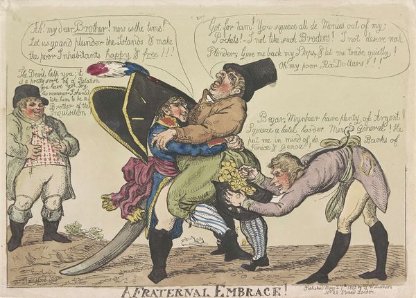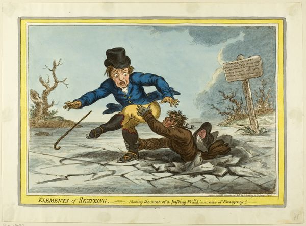 Curator: Look at the drama in this hand-colored etching! It’s entitled "The Elements of Skating: The Consequence of Going Before the Wind" by James Gillray, dating back to 1805. Editor: Goodness, pure chaos! I immediately register the dynamic, almost violent lines that describe the figures in motion. It’s viscerally affecting, with that sense of imminent impact. Curator: Gillray was a master of social satire, and here, he seems to be commenting on the fashionable, and perhaps perilous, leisure activities of the upper classes in England. It’s interesting how the visual structure emphasizes imbalance. Editor: Imbalance is the core, isn’t it? The asymmetrical composition perfectly reflects the precariousness of their situation. And note the limited colour palette. Predominantly blues, reds, and yellows that further intensify the central action. The tonal variation on the paper supports the overall cartoon aesthetic. Curator: The caricature is so precise. Look at the exaggerated expressions; one of fright, and the other seeming somewhat stern or perhaps merely stoic despite the mayhem. Beyond the surface absurdity, the work provides critical commentary, particularly on social standing, as indicated by dress, against natural, uncontrollable forces. This relates closely to the political cartoons that lampooned royalty. Editor: Yes, I’m especially drawn to how the aged paper and the faded watercolours amplify the sense of historical distance, yet the message about hubris or overconfidence in nature continues to resonate. The very material and aesthetic qualities deepen its critical perspective across time. Curator: The details really elevate this piece beyond mere caricature. I mean the background has a scene within a scene, people watching or perhaps assisting. Each component, carefully placed, directs focus back to the consequences depicted front and centre. Editor: Agreed. It is remarkable how Gillray used fairly basic visual tools, composition, colour, and exaggerated forms, to communicate such a potent, lasting narrative. It still triggers a gut reaction today. Curator: Considering its context within British social satire of the era definitely enriches how we grasp the artist's full message embedded within the drawing. Editor: True, but stripping away all the contextual baggage reveals the art’s raw power. I now look at its forms anew, freed from cultural assumptions, and that reveals another interesting facet of the image.