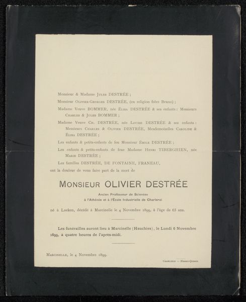 This printed announcement, created in 1919, commemorates Madame Paul Van Goethem. The most prominent visual element is the large, centered initial "M." This initial, standing alone, takes on a symbolic weight. Throughout history, initials have served as markers of identity, lineage, and memory, appearing on objects and buildings. Here, the "M" for "Madame" is both a personal identifier and a signifier of social status. Consider how the use of initials appears on ancient Roman monuments or Renaissance portraits, each time carrying a weight of history and personal identity. In psychoanalytic terms, the initial might also tap into our subconscious desire for order and meaning. The isolated letter, devoid of its full context, invites us to fill in the gaps, to project our own associations onto it. The "M" becomes a focal point for collective grief. The use of typography isn't just informative; it's emotionally charged. This simple letter has evolved through time, yet it continues to resonate with viewers on a deep, subconscious level.