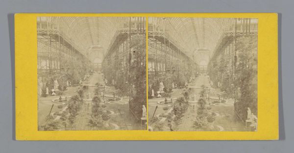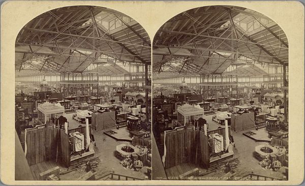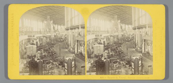 Curator: Today we’re looking at a stereoscopic daguerreotype by Léon & Lévy, titled "French Section in the Machinery Hall at the 1867 World's Fair." Editor: Wow, it’s incredibly detailed! There’s a certain Victorian grandeur here, but also something strangely unsettling about this massive hall of machines. Curator: Indeed, it’s a fascinating glimpse into the celebration of industrial progress. As a stereograph, it was created to provide a 3D viewing experience which would simulate actually standing in the Machine Hall. Consider the materials and labor involved: The photographic plates themselves, the complex apparatus to create a stereoscopic image, the sheer architectural scale. It’s a testament to both technological ingenuity and manufacturing might of the period. Editor: I see this image as a snapshot of a specific historical moment, fraught with contradictions. The World's Fair was a stage for colonial powers to show off their technological and industrial might, but also a place where the seeds of resistance were sown. Look at all those machines, silently powering the continued exploitation of workers and colonized lands. The picture also subtly reveals that gendered nature of work; I wonder who produced all of these machines. Curator: That tension you're highlighting speaks directly to my perspective on artmaking. These machines, conceived as symbols of progress, are in fact instruments within power structures of labor, colonialism, and patriarchal frameworks that demand critical consideration. Editor: Absolutely! It’s easy to get lost in the spectacle of the architecture or the supposed innovation on display here. We have to contextualize it, question the narrative that industrial advancement necessarily equated to progress for all people. This photograph also captures a kind of transitional moment in history; the era before widespread awareness of issues such as income inequality and resource exploitation had set in. Curator: It’s crucial to investigate how technologies not only transform the physical world but the way we, as human beings, construct society, how labor practices operate. This fair showcases power in the shape of machines. Editor: Well said. Looking at the photograph in this light prompts us to question and contextualize this notion of "progress.” This image encapsulates much more than just technological marvels. Curator: Precisely. When we delve deeper, art history becomes not just a history of art, but one of broader ideas. Editor: Absolutely. Thank you for providing those important layers to understanding this powerful image.