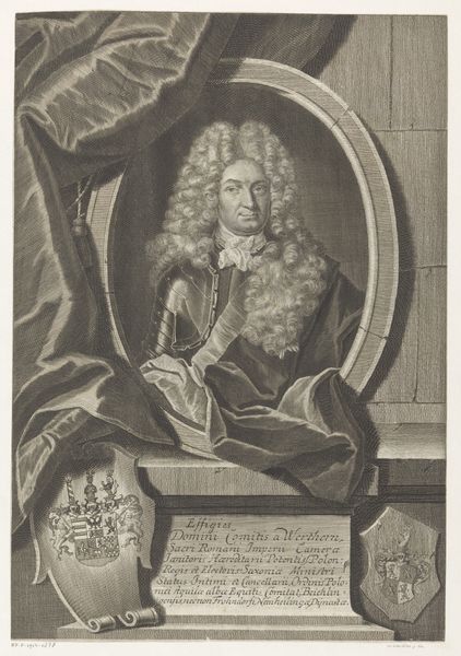 Editor: Here we have a print from 1707, "Portret van Heinrich Cocceji," by Martin Bernigeroth. It's an engraving and I'm immediately struck by the formality and the elaborate detail, especially in the hair! How do we contextualize portraiture like this within the baroque era? Curator: A great question! This engraving isn’t just an image; it’s a statement. Portraits like this, particularly of prominent figures such as Cocceji, were critical tools for constructing and disseminating power in the late 17th and early 18th centuries. The meticulous detail, as you noted, isn't just artistic flourish, it’s deliberate. Think about the cost and time required to produce such an intricate print – what message does that send about the subject? Editor: It suggests wealth and importance, absolutely. It’s almost like an early form of image branding. The coat of arms at the bottom must be another key element? Curator: Precisely. These symbols functioned as visual shorthand, instantly communicating lineage, status, and allegiance to a particular socio-political order. Consider how prints like these were distributed. Were they primarily for private consumption, or did they serve a broader public function? Think about the role they played in constructing a shared identity within the elite classes. Editor: I see…so it’s about cementing Cocceji's image, and reflecting the values of the ruling class. I hadn’t thought about the public role beyond simple commemoration. Curator: It's a good reminder that art often plays an active role in shaping public opinion and reinforcing existing social structures. This print shows how power was performed, consumed, and disseminated within society. It’s not just a likeness; it’s a carefully constructed image of authority. Editor: Thank you, that’s really illuminated how historical context shapes my understanding of visual imagery. It’s much more than just aesthetics; it's about societal dynamics!