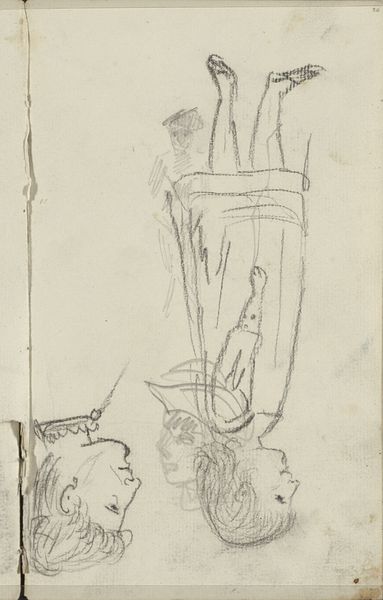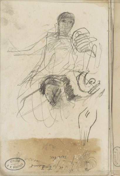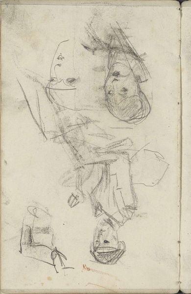 Editor: This is George Hendrik Breitner's "Studieblad met een staande vrouw en vogels," created between 1880 and 1882. It's a pencil and graphite drawing on paper. I'm struck by the ephemeral quality of the sketches. It feels like a fleeting moment captured. What do you see in this work? Curator: For me, this piece speaks volumes about the representation of women in art and society during that period. Consider the time frame, the late 19th century: the rising tide of feminism against the backdrop of rigid social structures. How do you see the woman depicted here? Is she active, passive, liberated, or confined? Editor: It's hard to tell, really. She looks so faint and undefined, almost like a ghost. Curator: Exactly. Breitner offers us a glimpse, not a concrete figure. And what about the birds? Are they merely decorative, or could they symbolize something more? Think about the common association of birds with freedom, with escape. Could the woman be longing for that? Editor: Perhaps she's dreaming of a different life? Being just a sketch, the piece invites more questions than answers. Do you think Breitner was consciously making a statement about women's roles? Curator: Whether consciously or not, every artist is a product of their time. Breitner was living and working amidst great societal change, the dawn of modernism. Even in its unfinished state, this "Studieblad" hints at the tensions and complexities surrounding gender and identity in that era. What do you make of its incomplete status, particularly in light of how women were excluded at the time? Editor: That’s true. Thinking about its incompleteness alongside those contextual elements brings so much depth to it. I now view it less as a study, but more as an assertion of an unseen world. Curator: Precisely. It opens up possibilities to reimagine those untold histories of the time.