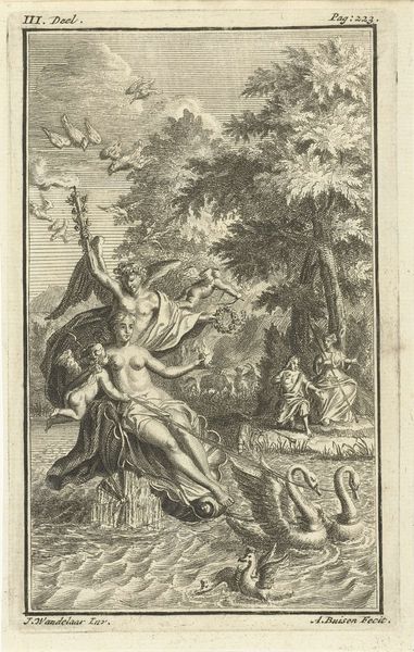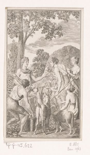 Editor: This print, "Heilige Benedictus," dates roughly from 1620 to 1667 and is attributed to Matteo Borboni. The lines create a dramatic, swirling composition. So much is going on. How do you interpret this work? Curator: From a formalist perspective, the engraving's power resides in the dynamism of the lines. Notice how Borboni uses line weight to define form and create contrast. The composition itself is interesting: figures are densely packed in the center, while the arched framing creates an interplay of interior and exterior space. What does this arrangement evoke for you? Editor: The way the figures are arranged certainly makes them seem central to whatever's going on in the print. The light coming from behind almost puts them on display, in a way. Is there significance to the arch at the top of the image, the way the image itself is shaped? Curator: Precisely. The arch can be seen as a formal device. It structures the visual field, guiding the eye, framing the central narrative—whatever that may be, formally. The lack of colour only emphasizes the linearity. The medium itself is also an important consideration, do you find that engraving techniques lend themselves better to certain messages, more so than other printing methods like etching or lithography? Editor: Well, etching can feel looser, I guess. Engraving definitely emphasizes crisp lines and finer detail. I see how that lends itself to that formal emphasis. I suppose I never thought about how medium influences message like that. Curator: Considering how visual language functions gives you insight into the aesthetic experience. A careful evaluation of material properties opens the pathway to analyzing not just how it presents itself, but the larger role that forms and styles play within the work itself. Editor: This has given me a whole new way of approaching prints! Thank you.