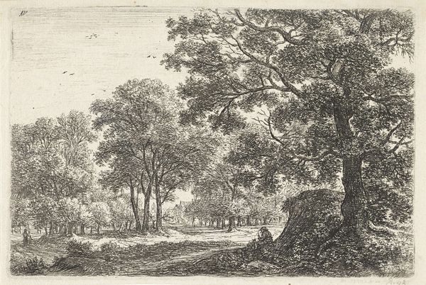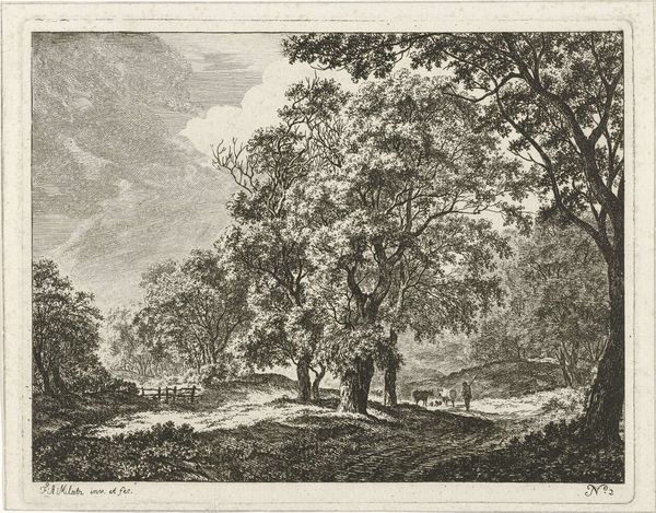 Franciscus Andreas Milatz made this landscape with trees and a rider on a road using etching techniques. The etching gives us a glimpse into the late 18th-century Dutch countryside, a time of social and economic change. The presence of a rider suggests a hierarchical society where land ownership and mobility were signs of status. Milatz was a student at the Haarlem Stadstekenacademie. This state art school was responsible for training draftsmen for trades and industries. It also stimulated art collecting and the development of art criticism. Note the way the artist carefully portrays nature, indicative of the era’s growing interest in landscape as a subject. The detailed depiction of trees and the atmospheric perspective evoke a sense of the sublime. This artwork invites us to reflect on the changing relationship between humans and nature during the Age of Enlightenment. By studying historical records and cultural contexts, we can gain a deeper understanding of its significance.
