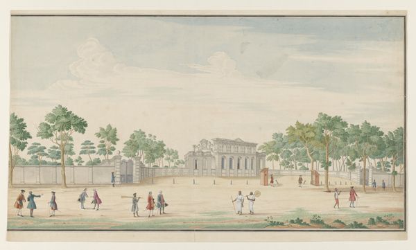 Curator: Welcome. Let's turn our attention to an 18th-century watercolor titled "Gezicht op het Paleis Huis ten Bosch te Den Haag gezien vanaf de tuin", attributed to Paquier. Editor: It's serene. The delicate brushstrokes and pastel shades create a sense of airy lightness, despite the formality of the architecture. The Rococo style shines through, softening what could have been an austere palace. Curator: Rococo's influence is undeniable. This piece, of course, speaks to the cultural milieu of the Dutch elite. The House ten Bosch, a summer palace, was often depicted as a symbol of power and status, but here it is portrayed from the gardens, inviting a look at the leisured lifestyle associated with the Princes of Orange. The palace acted as the stage for courtly life and diplomatic ceremony, so this visual reminder held symbolic importance. Editor: I see what you mean. Look how the composition subtly guides your eye, starting from the finely drawn carriage in the foreground to the perfectly manicured garden and finally resting on the symmetrical structure of the palace. Even the bridge is perfectly aligned to maintain sight to the building’s architectural lines and central dome. The use of light contributes, accentuating depth through gradations of color from near to far. Curator: These cityscape and genre scene paintings allowed patrons a glimpse of important spaces while reflecting specific class norms. Prints like these, that were made after the painting, served as a means of circulating these ideas to an increasingly wider audience. The landscaping itself represents a social effort to create an illusion of control over the natural environment, reflecting human power. Editor: Agreed. However, it's more than propaganda. Observe the carefully placed figures adding life and scale, reinforcing the harmonious interplay of architecture and nature. It's really a masterclass in Rococo landscape, don't you think? Curator: From my point of view, it showcases the evolution of representations of power, subtly shifting from formal portraiture to scenes embedded with symbols of wealth and class, tailored for a specific socio-political environment. Editor: And for me, a gentle invitation into an age of refinement.