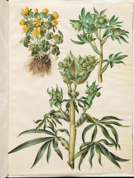 Editor: So this beautiful rendering of Eryngium planum, or blue sea holly, created between 1649 and 1659 by Hans Simon Holtzbecker, really struck me with its delicate colour palette and scientific accuracy. It feels very meticulous. What aspects of this piece draw your attention? Curator: What immediately stands out is how these botanical illustrations were crucial to the development of scientific understanding and botanical knowledge at the time. Holtzbecker, as a court painter, was contributing to a larger movement driven by wealthy patrons interested in natural history. Consider who these images were made for. Who had access to them, and what kind of power did that bestow? Editor: That's a really good point! I was so focused on the aesthetics that I missed the socio-political implications of botanical art as a status symbol, especially back then. So, it wasn’t just about pure science? Curator: Precisely. While serving a scientific purpose, these works reinforced social hierarchies and illustrated the power dynamics embedded in exploration, colonialism, and access to knowledge. The rarity of this ‘exotic’ species of Eryngium in Northern Europe added value to it. Does that change how you see the image now? Editor: It definitely does! It shifts it from a lovely, precise rendering of a plant to a symbol of privilege and control. Like owning the rights to display, document, and study a piece of nature. Wow, I learned something important today! Curator: Me too! Examining the social contexts gives it depth and reminds us that art is not created in a vacuum. Next time you see a seemingly straightforward nature rendering, I invite you to reflect upon the dynamics of wealth and representation it signifies!