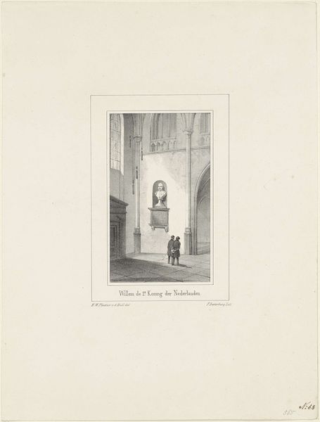 Curator: This is "Grafmonument Nikolaas van der Leur in de Sint-Bavokerk in Haarlem," dating from 1817 to 1896, presently housed at the Rijksmuseum. It is an engraving by François Desterbecq. Editor: My immediate reaction is to the strong architectural forms depicted in this monochrome image, how they draw the eye upward into the heights of the building and also deep into the background. Curator: Indeed. This piece provides us insight into 19th-century memorial culture and the architectural spaces used for commemorating important figures. Van der Leur must have been quite a prominent individual. The location within the Sint-Bavokerk also suggests a connection to the religious establishment. Editor: Note how the architectural detail is so meticulously rendered. The artist’s expert handling of light and shadow emphasizes the monument's solemn grandeur and uses realism to create a great sense of scale, which dominates the scene. Curator: This level of detail echoes the style of academic art, reflecting an interest in accurate representation alongside idealized depictions. Also notice the human figures included here: they highlight the monument's function within the church, not just as a marker but as a site for continued public interaction. Editor: Yes, and those figures enhance the picture’s composition: a few simple, but crucial strokes there. Though small, they allow us to understand that while somber, the space retains elements of day-to-day life. Curator: Precisely! And its depiction as a cityscape brings forth notions of urban pride. It brings Van der Leur into relationship with Haarlem itself. Editor: We can both agree this artwork is so carefully calibrated as to present and preserve, within itself, much more than it obviously represents! Curator: Absolutely. Desterbecq gives us a snapshot of society, memory, and the visual strategies through which both are constructed and reinforced in their time.