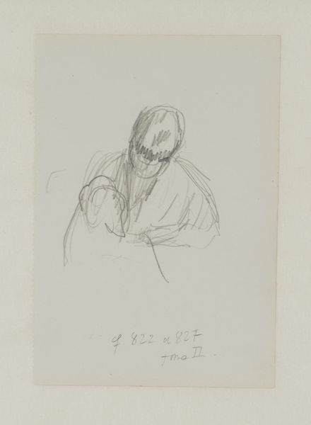 Curator: Immediately, a feeling of melancholy washes over me; the bowed head and clasped hands convey such weariness. Editor: This is a line drawing entitled "Standing Male Figure," attributed to Jean-Louis Forain. Its spare execution really underscores your observation. Curator: It's such a simple rendering, and the artist seems to be deliberately avoiding a sense of completion. I find that incredibly effective. It makes me wonder what kind of paper was used. What medium did Forain employ? Editor: Based on what we know, he created it using drawing as the main material; the marks really suggest a fluidity suggesting pen and ink. The figure has an almost industrial uniformity in the parallel strokes—the labor seems explicit. I imagine a whole stack of similar portraits being created quickly for a satirical newspaper, reflecting some critical commentary. Curator: Yes, the quickness, that sense of almost disposable production – I think you are right. This artwork makes me think about labor. Was Forain thinking about class, do you think? His subjects certainly touch the themes of disenfranchisement in Belle Époque France, that anxiety around class status… It invites broader narratives around societal inequalities, power, and perhaps disillusionment. Editor: Precisely! And if we consider Forain's known artistic tendencies towards critique and satire, we see how material constraints and available medium affect how potent or easily his subjects touch certain political and sociological topics. Curator: Absolutely. It has shifted the focus toward how Forain portrays specific classes and genders within those broader social systems. Thank you! Editor: It reminds me that context can truly amplify and change a piece's social currency and materiality in really fascinating ways.