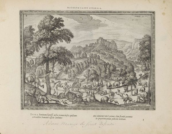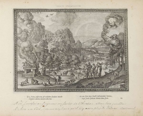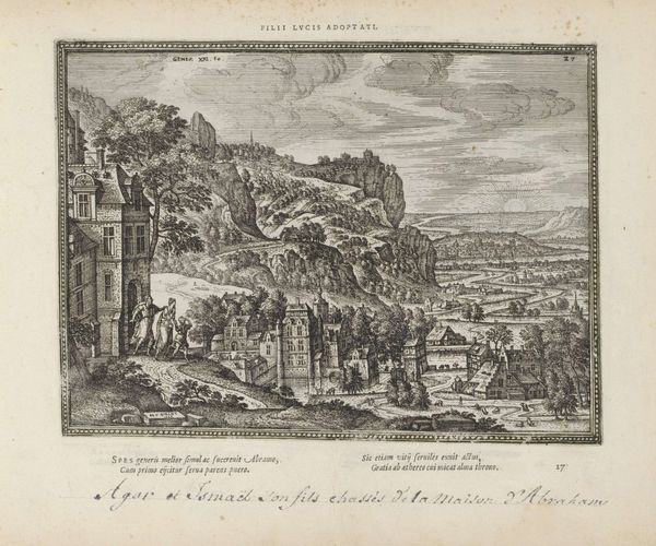 Curator: Look at this fascinating etching, "The Reconciliation of Jacob and Esau," created sometime between 1582 and 1613 by Pieter van der Borcht. It resides here at the Rijksmuseum. Editor: It’s captivating! The composition draws my eye immediately to the foreground figures locked in an embrace. There’s something both tense and relieved about the scene. But there’s so much happening; my gaze bounces around a bit. Curator: The material itself, the etched line, carries a significant weight. Consider the labor involved in creating this image, reproducing biblical narrative through a network of finely wrought lines. How might access to this print alter viewers understanding of social cohesion and order, especially between those fractured communities facing schisms? Editor: Right. It acts almost as propaganda, this idyllic setting with landscape, cityscapes and historical references combined. It shows a seemingly impossible resolution – one imagines these characters must belong in separate realities until one considers, in a post-Reformation Europe, the need for peace. Is this, perhaps, why the city backdrop becomes so prominent? An emblem, or stand-in, for what awaits a war-torn society should the figure in the fore ever accomplish some real absolution? Curator: I appreciate you mentioning how the city figures within the greater whole! Let’s not forget the etcher's agency, working under specific social circumstances of commissioning, display, distribution. To consider consumption, its production must too undergo rigorous examination. What impact might the market system influence its reception for widespread access among citizens across Europe, many embroiled amidst years long clashes over religion and identity-politics related feuds. Editor: Exactly! It’s like viewing this image through two lenses – the biblical narrative, and the period’s deep anxieties and longings. The politics behind image production! Curator: I concur. I find myself meditating about Van der Borcht and workshop associates within this complicated ecosystem, grappling amidst complex web made-up intersecting cultural discourses shaped around their intended viewers! Editor: And the way art participates in not only recording history, but helping to construct it. Fascinating how this single image packs layers to be explored—perhaps as dense as that town sitting within it.