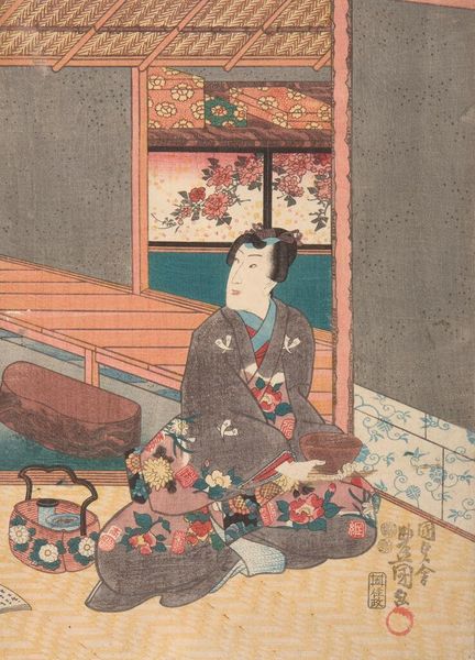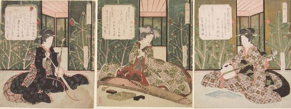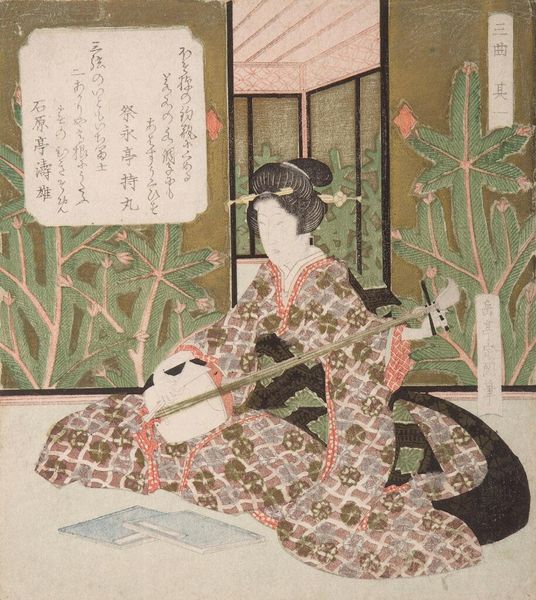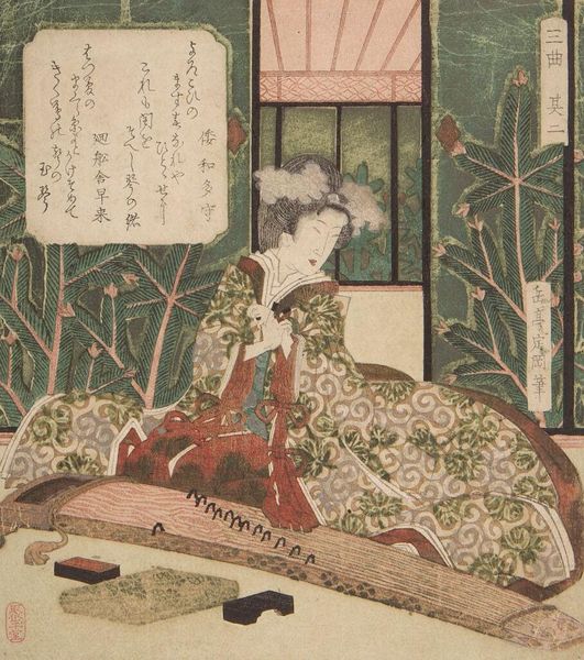Curator: Yashima Gakutei, active in the first half of the 19th century, is the artist behind this print titled "Woman Playing Kyokū, Number Three" from the series "Three Musical Instruments," currently held at the Harvard Art Museums. Editor: It evokes such a serene, contemplative mood. The subdued colors and the woman's downcast gaze really draw you into her private world. Curator: The Kyokū, a plucked lute-like instrument, creates a meditative atmosphere often associated with the samurai class; these instruments were embraced by the literati circles of the Edo period as well. Editor: Interesting. I wonder how Gakutei’s depiction of a musical woman reflects the evolving role of women in the increasingly complex socio-cultural landscape of 19th-century Japan. Her presence here suggests the social status of women playing musical instruments. Curator: Note how the artist integrates text and image; it alludes to the cultural value placed on harmonizing sensory experiences, such as visual and auditory perceptions. Editor: That interplay is really lovely. Seeing the print alongside those thoughts makes me reflect on the power of art to connect us to past experiences.