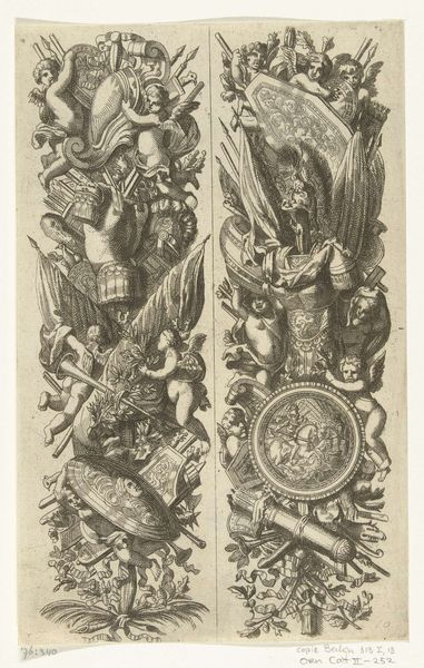 Editor: Here we have Abraham de Bruyn's "Wapenschilden," made in 1577. It's a black and white print featuring a series of heraldic shields. It has a very formal, almost austere feel to it. What stories do you think it tells? Curator: This piece speaks volumes about power, lineage, and identity in the late 16th century. Heraldry was never simply decorative; it was a visual language of social hierarchy, political alliance, and ownership. The arrangement and details of these "Wapenschilden" offer insights into the complex web of relationships within European aristocracy. Editor: So, it's not just art for art's sake? Curator: Absolutely not. Consider who this piece was intended for. Likely, it was circulated amongst a very specific, elite group who understood the nuances of each coat of arms. Who controlled the means of visual production, and whose stories were deemed worthy of preservation through printmaking? How do we analyze such seemingly 'simple' geometric configuration to discover which families were elevated and why? Editor: I see what you mean. The symbols tell of societal structures, what the elite value, who has power. Is that why there are cherubs mixed with eagles, crosses, and lions? Curator: Precisely. Those classical, religious, and mythological images were intentionally placed there for rhetorical flourish, imbuing authority, virtue, and divine right onto earthly, ruling houses. De Bruyn's image can also provide insights into gender dynamics. Are certain familial lines elevated above others? Do female members receive the same heraldic representation? These details offer further dimensions to our interpretation of this era's power structures. Editor: So by analyzing something like this, we can unravel more about power structures of the time? Curator: Exactly! Analyzing this print allows us to connect art history to gender studies, cultural studies, and even political science. The questions this image raises speak directly to larger contemporary dialogues surrounding inequality and identity. Editor: I never thought a heraldic image could be so politically charged. I guess there's so much more than meets the eye at first glance! Curator: Indeed. And by critically examining the image's context, we can find resonance within its narratives to question present social and political hierarchies, too.