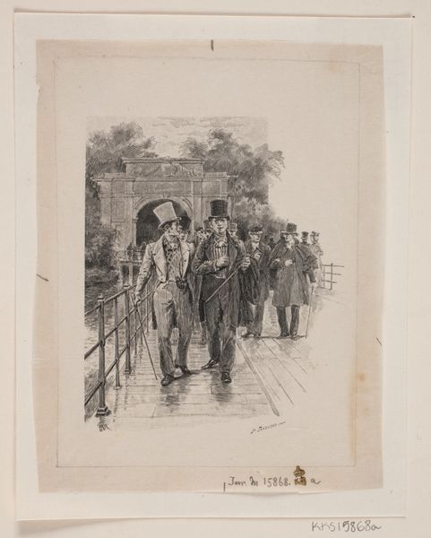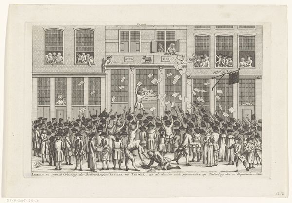 Curator: This lithograph is entitled "Spotprent op C. Seyn," which translates to "Cartoon of C. Seyn," created by an anonymous artist sometime after 1838. The medium combines drawing and print techniques to convey a lively, narrative scene. Editor: The overall mood strikes me as subtly chaotic, almost farcical. The stark contrasts between light and shadow emphasize the manic energy of the bustling figures on the right side, and it really pulls the eye around the scene. Curator: It's a clever social commentary typical of the period. Look at how the artist contrasts the solitary figure of C. Seyn, keys in hand as if returning home, with the group celebrating his absence. The text underneath hints at their financial gain, suggesting Seyn’s return might disrupt their newfound prosperity. This image reflects a period of economic and social upheaval. Editor: The composition guides your eye, doesn't it? The three figures with top hats form a sort of line of sight that points straight to that energetic gathering near what seems like a "furniture sale" happening beneath a tent. The furniture items hint that there has been a recent selling-off of possessions. The somewhat distressed edges also contribute a textural feel, almost suggesting the work's historical context in their imperfect form. Curator: Indeed. Prints like these were important forms of public discourse. By using recognizable caricatures, the artist directly engaged the public, prompting conversations about individuals like Seyn, likely involved in some scandal or public event of the day. The use of realism serves not just as an artistic style but as a potent tool for satire. Editor: It is fascinating to notice how the artist has constructed layers within this single composition, drawing our attention through light and shade. The dark doorway on the left with its lone figure directly contrasts against the brighter tent sale scene on the right, inviting an interpretive journey, from quiet uncertainty to outward celebration. Curator: Looking at "Spotprent op C. Seyn" allows us a glimpse into the Dutch socio-political landscape of the 19th century, showing how prints were used as vehicles for political commentary. Editor: The way it captures motion and emotion, making this more than just a record—it is an observation of an almost theatric situation that makes one pause.