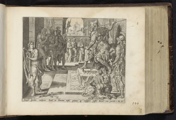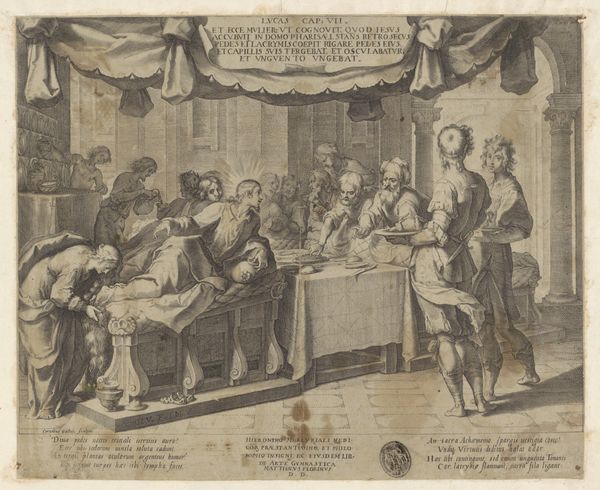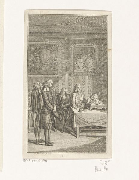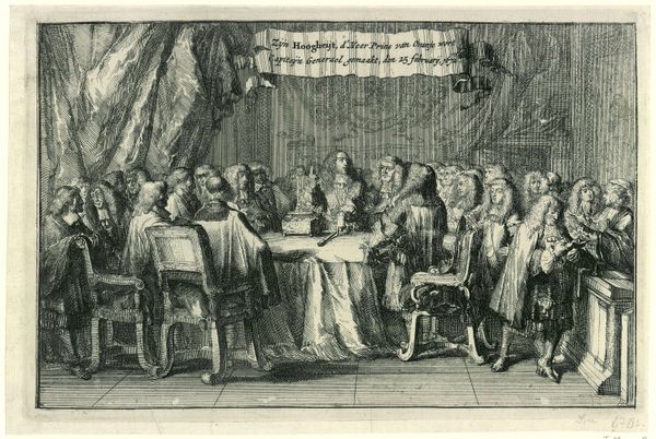 Curator: This engraving, now in the Rijksmuseum, depicts Willem III being sworn in as stadtholder in 1672. It's attributed to an anonymous artist and thought to have been created sometime after 1674. Editor: The scene feels… formal. A collection of wigs, ermine, and controlled gazes, all tightly composed in monochrome. I wonder, what is being consciously left out of this official picture? Curator: The historical context is key. The Dutch Republic was in crisis, facing invasion. This scene marks a turning point, the reinstatement of the House of Orange amid immense pressure. It visually represents restored authority and stability in the face of national peril. Editor: Absolutely. The very staging feels strategic. Every figure, seemingly an emblem of power arranged carefully in relationship to each other. Yet there's something distancing, as though we, as viewers, are deliberately held outside the circle of power. Who was the intended audience for such an image, and what message were they supposed to internalize? Curator: It was likely circulated to reinforce support for Willem III. Engravings like these were crucial visual propaganda, creating and disseminating an image of strong leadership and national unity. Think of it as carefully orchestrated branding. Editor: That makes me think about representation and accessibility. Given the format and likely distribution, this image would have mostly reached the elites and literate classes. What about the common people and their diverse experiences of that period? Their voices, quite literally, are not inscribed in the image. Curator: True, engravings often served the interests of the powerful. However, these images shaped the collective memory, influencing how future generations perceived this pivotal moment in Dutch history, solidifying Willem's heroic status. Editor: Which raises a question: How do we, today, navigate such curated narratives? Recognizing that this isn’t a transparent window onto the past but a constructed image imbued with ideological intent—a vital step in engaging with both art and history critically. Curator: Precisely. This engraving offers a potent lesson on the role of imagery in shaping historical narratives and wielding social control, reminding us that even seemingly straightforward depictions can carry profound political weight. Editor: So, by analyzing not only what is presented but also what is consciously omitted, we can unlock deeper insights into the social forces and power dynamics at play during Willem III's era.