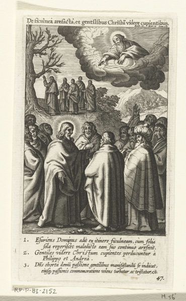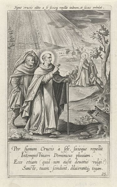 Editor: Here we have Theodoor Galle’s engraving, “Conversion of Heretics by Saint Dominic,” from 1611. The intricate line work is remarkable; however, I am somewhat unsure what to make of the composition with Saint Dominic placed in the middle ground, seemingly smaller than the Bishop standing to his right. How do you interpret this work? Curator: It is critical that we study the visual language deployed within the pictorial space itself. Note, for instance, the use of line. The crispness of the lines and precise detail create a sense of formality and order, typical of Baroque engravings. Look at the textures created; can you see how Galle masterfully suggests depth and volume? Editor: Yes, now that you point it out, I can see how the varied thickness and density of the lines really bring out form. It’s particularly visible in the drapery. What is the impact of rendering a historical moment with this technique? Curator: This work privileges symbolic representation over pure naturalism, emphasizing an allegorical theme, if you will, over mimetic accuracy. The deliberate arrangement and stylized presentation allow the image to resonate as both an account of conversion, and also an investigation of the power, and its potential impact, within faith. Editor: I now have a deeper appreciation for the choices that were made during production, I see how even the finest lines and formal arrangement contribute towards interpreting meaning. Thank you! Curator: The pleasure was all mine, particularly when it comes to recognizing the significance within its visual and theoretical dimension.