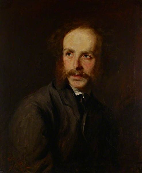 James Archer painted this portrait of John Maclauchlan, Chief Librarian of Dundee Free Library. The portrait is composed with careful consideration to color and form. Observe how the dark suit contrasts with the pale skin tones of Maclauchlan’s face, drawing our eye directly to his gaze. The artist uses a limited palette, relying on subtle shifts in tone to create depth and volume. The background is undifferentiated and pushes the subject forward, emphasizing the sitter's presence. The book which he holds in his hand, signified by its redness, signals knowledge and authority. Yet, the way he holds it, almost as an accessory, might suggest a more complex relationship to learning and power. The portrait, therefore, oscillates between presenting Maclauchlan as a figure of authority and hinting at the constructed nature of such roles. The formal choices in this portrait, from the color palette to the composition, prompt us to consider how visual elements communicate ideas about identity, occupation, and social status. This is not simply a record of appearance, but a carefully constructed representation of a man and his position within society.