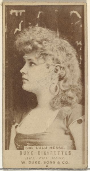 Editor: Let's take a closer look at "Card Number 744, Lulu Hesse," a portrait from the Actors and Actresses series made in the 1880s by W. Duke, Sons & Co., now residing at the Metropolitan Museum of Art. It's a small printed photograph used to promote Cross Cut Cigarettes. There's something about the direct gaze that is rather captivating! What draws your attention most when you see this piece? Curator: The fact that we’re even looking at it now, generations later, because it was tucked inside a cigarette pack… there's a kind of beautiful accident to that, isn't there? Like a message in a bottle from a bygone era, still bobbing along the waves of time. And think about Lulu Hesse herself. This fleeting moment, designed to sell smokes, becomes something far more enduring: a question. Who was she? What was her story? I think this photo has a strange aura of timelessness. Editor: That makes me consider the commercial purpose of this piece—was Lulu Hesse famous at the time, which could benefit cigarette sales? Curator: Possibly. But fame then wasn’t what it is today. More like a localized sparkle, a flicker in the vaudeville circuit, perhaps. The real star here might be the idea of celebrity itself, and how fleeting it can be. We are lured into smoking these "Cross-Cut Cigarettes", because a star seemingly endorses it, and now we, so long later, ask who she was. A curious immortality, wouldn’t you agree? Editor: Very much! I didn't think of it that way at all, but the commercial context has certainly given the portrait a kind of accidental longevity, turning Lulu into something of an enigma. Curator: Exactly! Isn't it funny how an object made for such a temporary purpose can reveal so much about a different world. Editor: Yes, that's amazing! It completely changed my view on this particular print. Thanks for illuminating that.