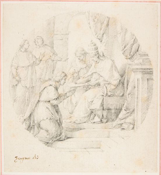 Charles Onghena created this drawing, "Maria met Christus en heiligen," using lines to depict the Virgin Mary with Christ and saints. The composition is structured within a delicate architectural framework, its arches and columns providing a backdrop that both confines and elevates the central figures. Notice how Onghena employs the interplay of lines to define form and space, creating a sense of depth. The figures, draped in classical robes, are rendered with precise contours, their gestures and expressions suggesting piety and reverence. This aesthetic borrows from Neoclassical ideals, emphasizing clarity, order, and moral virtue through its representation of religious figures. The drawing's aesthetic rigidity can be read as a reflection of broader cultural codes and the desire to reinforce religious orthodoxy during Onghena's time. This work invites us to explore how art not only represents but also reinforces particular visions.