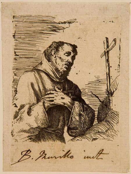 Editor: Here we have Georges de la Tour's oil painting, "The Tears of St. Peter," created around 1645. It's strikingly stark. The man's expression, the somber lighting, and the presence of the rooster – it all feels so deliberately staged. How do you see the visual construction of this piece affecting its impact? Curator: The first element that strikes is the severe contrast between light and shadow. This tenebrism, typical of La Tour's mature style and indeed, much Baroque painting, functions structurally. Observe how the light source, presumably the lantern, dramatically models St. Peter’s face, accentuating the furrows and capturing a sense of inner turmoil. Consider the spatial arrangement; how does La Tour place Peter within this tightly compressed space? Editor: It’s almost claustrophobic. He's pressed right up against the wall, and the rooster is there, too. There's very little depth. Curator: Precisely. The compression emphasizes the psychological tension. Furthermore, consider the restrained palette. The dominance of earth tones—ochre, umber, and sienna—contributes to the solemnity. Ask yourself, why would La Tour purposefully select that combination? It is evident he focused on visual arrangements. The viewer becomes very close to Saint Peter in his despair. Editor: So it’s all about the light and the structure, the relationships within the frame itself. No external references needed, as it all resides within this visual plane? Curator: To a significant degree, yes. It underscores that form and composition serve as meaning within themselves. One does not always require extensive external context. What will you be looking at next? Editor: I appreciate that fresh insight! I'll try to focus on those qualities in the next gallery.