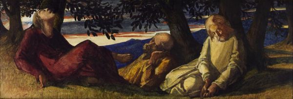 Editor: We’re looking at Pierre Puvis de Chavannes’s painting, "Sleep," likely completed between 1867 and 1870. It's oil on canvas and presents a group of figures slumbering in a field. The overall tone feels both peaceful and a little melancholy. What historical forces might have shaped this image, and how was it likely received? Curator: That’s a very insightful initial read. Puvis de Chavannes worked in a period where academic art was beginning to be challenged by emerging avant-garde movements. “Sleep,” with its classical composition and muted palette, positioned itself against the rising tide of Realism and Impressionism, although its symbolism offered a bridge. How do you see the composition contributing to its social impact? Editor: It's interesting you bring up the composition. The figures are arranged almost like a frieze, which gives it this sense of timelessness but also detachment. Is this a deliberate attempt to evoke the past while distancing the scene from contemporary social issues? Curator: Precisely. Puvis often looked to the past for inspiration. Paintings like this offered viewers a respite from the rapidly changing modern world. These works served a conservative function in visualizing harmony while anxieties about industrialization and urbanization rose. Notice, too, how this idealization contrasts sharply with, say, Courbet’s unflinching depictions of working-class life from just a few years prior. Do you think the public would have understood the purpose of paintings such as Sleep at the time? Editor: Probably a mixed response, I imagine. Some longing for a sense of order, others seeing it as outdated and irrelevant given social inequalities. I learned about the role of art and the different interpretations the public can have depending on socio-historical moments! Curator: Absolutely! These images served as touchstones for societal anxieties while providing an imagined visual and emotional escape.