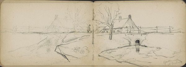 Curator: Willem Cornelis Rip's "Landschap met huizen te Deurne," likely created between 1896 and 1897, captures a scene in Deurne using delicate pencil strokes. Editor: It’s faint, almost like a half-remembered dream. See how lightly the houses are rendered, dwarfed by those looming trees? Curator: Absolutely, there’s an ethereal quality, which, paradoxically, is also very grounded. Consider Rip's process: pencil on paper. These weren't luxury materials; this suggests a quick, almost urgent desire to record the landscape. Editor: The accessibility of pencil certainly democratized art-making, but I’m also seeing an artist consciously choosing to highlight process and immediacy. There's labor present in each mark. Were these meant to be preparatory sketches, studies of form? Curator: Quite possibly, yes. They exemplify Impressionist leanings mixed with a realist drive to capture an immediate sense of place. Look closely—there is a house. Can you make it out? Barely. Editor: Barely indeed. The lines seem provisional, unsure. What's so poignant is the contrast. Fragile human dwellings nestled into that chaotic abundance. Nature seems to reclaim even these traces of man. Curator: The scene does suggest a transient moment, yes, even though this village of Deurne existed and exists still! It has a touch of melancholic observation. I wonder, too, about the paper itself. The support is integral, part of what holds the marks in tension, right? Editor: Exactly. And a mass-produced paper of this era speaks volumes about shifting industrial contexts impacting the accessibility of materials, hence affecting what and how artists choose to represent and reflect. Curator: What resonates with me is the simplicity—the artist's direct gaze, the ephemeral quality captured with minimal means. We see what the artist saw—we were standing behind him with a similar perspective, looking on as one fleeting instant dissolved. Editor: I see more than just what he saw: the invisible network of labor and resources, the industrial underpinnings of 19th-century image making, all converging here. A landscape sketched—but made by so many hands.