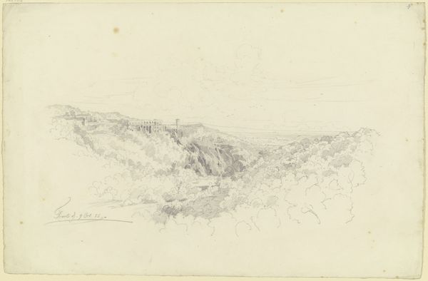 Editor: So, here we have "Aussicht von der Burg Montclair," a pencil drawing on paper done in 1852. Looking at it, I feel a sense of quiet contemplation. It's muted, peaceful. What strikes you about this piece? Curator: That quiet is key, I think. There's a kind of pre-photographic stillness here. The landscape is rendered with incredible detail, yet there's an overall softness, like a memory. It feels… observed, internalized, and then offered back to us, almost as a shared secret. Do you see how the eye is led into the distance, layer by layer? Editor: Definitely. It’s subtle. Like following a winding path…literally. What do you make of its Romantic style? I tend to think of huge, dramatic canvases for that movement, not drawings of trees. Curator: Ah, but Romanticism isn't always about grand gestures. Sometimes it’s the quiet whisper of nature, the intimate connection between the individual and the world. The detail of the trees contrasts sharply with the ghostly expanse in the background, doesn’t it? It pulls you in close, while simultaneously reminding you of the vastness beyond. Like an endless echo. I wonder what Montclair meant to the artist personally... Editor: An interesting thought. I hadn’t considered that. It definitely reframes how I view it. More personal and reflective, as opposed to simply representational. Curator: Precisely. The beauty here is the blend of reality and feeling, wouldn’t you say? It gives the landscape this quality of…almost dreaming. And what a dream to share with us.