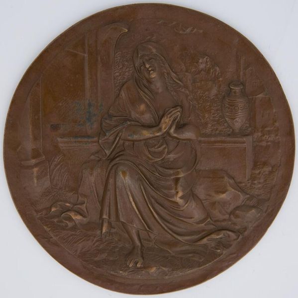 Curator: This bronze plaquette, around 17 centimeters in diameter, depicts "The Judgment of Solomon," an anonymous work held here at the Harvard Art Museums. Its circular form and raised relief give it a tactile quality. Editor: It's such a dramatic scene, isn't it? The figures are so expressive, conveying a real sense of anguish and moral tension. Curator: Absolutely. The composition places Solomon centrally, presiding over the would-be infanticide, reflecting the socio-political emphasis on patriarchal power during the time it was made. Editor: I'm struck by how the artist uses the female form to express vulnerability and defiance. The woman kneeling, arms outstretched, embodies a maternal resistance against the very real threat of violence sanctioned by the state. Curator: It’s compelling to consider how the history of representing power intersects with gendered experiences of justice. Editor: Precisely, and even today, the plaquette serves as a potent reminder of how legal and social systems can be used to perpetuate inequality. Curator: It makes you consider whose stories are elevated and whose are silenced within historical narratives. Editor: Indeed, and I feel that by examining this artwork through a contemporary lens, we can foster critical dialogue around the ongoing struggle for equity.