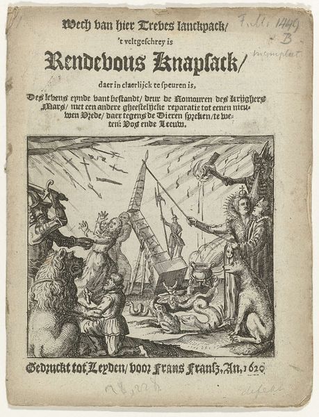 This is the title page of the pamphlet "Boeren-Litanie ofte Clachte der Kempensche Landt-lieden over de ellenden van deze lanck duerighe Nederlantsche Ooologhe", or "Farmers' Litany or Complaint of the Campine Country People over the Miseries of this Long-lasting Dutch War", created in 1607 by an anonymous artist. The image depicts the meeting of two couples, one well-dressed and one dressed in rags and barefoot. This expresses the ravages of the Eighty Years' War. The stark contrast in attire between the two couples underscores the deep divisions and inequalities exacerbated by prolonged conflict. It invites us to consider the intersection of class, conflict, and identity during this period. The central theme of slavery is reflected in the word "slaverni" placed at the bottom of the image. It serves as a stark reminder of the social and economic exploitation inherent in the war. Through this image, we are invited to reflect on the personal and emotional toll of conflict, and on how such experiences shape both individual and collective identity.
