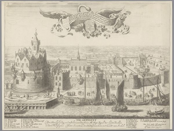 This detailed print, "Gezicht op het kasteel van Gorinchem," was created by Jacob van der Ulft in the 17th century. At first glance, the eye is drawn to the castle's complex structure, a collection of geometric forms rendered with meticulous precision. The light and shadow create a stark contrast that accentuates the architectural details. The composition employs a high vantage point, typical of the period, allowing us to observe the town's layout as a structured, almost diagrammatic space. This ordering of space mirrors the prevailing intellectual currents of the time. The lines and angles of the buildings are clearly delineated, reflecting a desire for order and rationality, mirroring the influence of classical ideals on the Dutch Golden Age. Consider how van der Ulft uses the semiotic language of architecture to convey power and control. The imposing castle, with its high walls and strategic placement, becomes a signifier of authority and security. This artwork serves not just as a representation of a place but as a statement about the societal values and structures of its time.