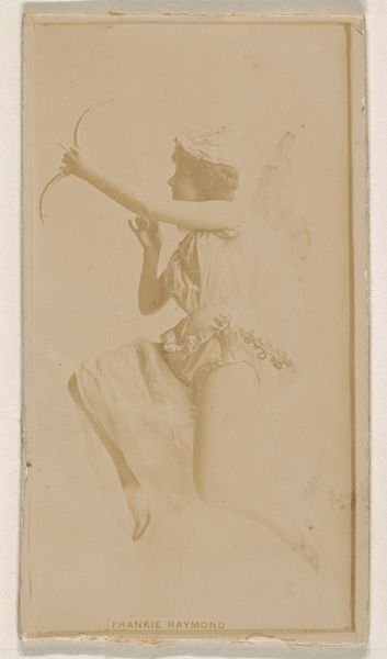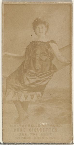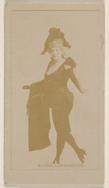 Curator: This photographic print, circa 1890 to 1895, features an actress advertising Duke Cigarettes, specifically as part of the "Actors and Actresses" series. What’s your first impression? Editor: She strikes me as confidently theatrical. The slightly faded sepia tone casts an almost dreamlike veil over the figure, which actually enhances the dramatic impression. What do you see in her presentation? Curator: I’m struck by the way the image positions this actress within a historical context, likely shaped by restrictive societal roles and the pressures on women, especially performers, at the time. Editor: I find her expression and pose intriguing. She's gesturing outwards, perhaps inviting the viewer into her performance or perhaps as a way of commanding your attention, and I am intrigued by her hat. To me, that hat—all plumes and ornamentation—is almost a scepter, a sign of power and visibility. Do you agree? Curator: To me it speaks of performative constraints—the expectation that female performers embodied a heightened femininity while being marketed for mass consumption. These actresses were often constrained in both public and private spheres, forced to play a complex role on and off stage. The marketing tactics of Duke Cigarettes also reveal an objectification of women within the commercial sphere. Editor: That's a good point—how commercialization affects imagery. Though for me the elaborate detail also underscores something grander, beyond constraints. This piece highlights the idea of theatrical artifice in terms of symbols like gesture and clothing. Curator: By examining this photograph, we start to uncover these women's struggles within a capitalist structure where identity became a tool for commodification. And consider how many performers were exploited, underpaid, and controlled during that period. Editor: It really prompts us to contemplate celebrity then, now, and the ever-shifting relationship between the performer, image, and audience. Curator: Precisely. This print isn't merely an image; it's a cultural artifact ripe for investigation through many different perspectives. Editor: I agree; a fleeting glimpse, made timeless.