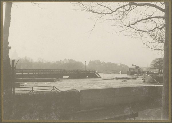 Curator: Oh, wow, bleak beauty. That's what hits me first. Such stillness, even with all those soldiers. Editor: You're looking at "Colonne soldaten in de sneeuw" or "Column of Soldiers in the Snow," a gelatin silver print dating from 1940 to 1945, currently held at the Rijksmuseum. It's a chilling piece of photography. Curator: Chilling indeed, both visually and... spiritually? Look at the way those horses and cannons are marching on, a ghostly procession through a stark, white landscape. It's almost like watching a memory fade away. Editor: Well, considering its historical context, this photo resonates with themes of conflict, occupation, and the erosion of peace in wartime Europe. The anonymous nature of the photographer only deepens the mystery and universality, don't you think? Curator: Absolutely! The absence of a known artist becomes its own statement. We're not focused on a singular perspective; instead, we're confronting a shared experience, a collective trauma frozen in time. I wonder what that bench witnessed. Editor: Yes, I keep coming back to this composition—the snow, the slight perspective, almost as if from an upper story window…and the layers upon layers of implied power dynamics at play. Whose vantage point is this photograph offering us? Curator: It’s also very formally composed; look at how the bare trees reach towards the sky, mirroring the rigid verticality of the utility poles lining the road, juxtaposed to the vulnerable people traveling that path. What kind of "progress" is this image portraying? Editor: Exactly! This tension speaks volumes about the insidious nature of war, how it permeates every facet of life. And that contrast between the figures marching in the road, which symbolize an established power structure versus the bleak empty whiteness speaks of a world devoid of human care. Curator: I keep thinking about all that weight trudging through such deceptively soft snow, with nature silently baring witness. Editor: Perhaps this visual representation of a silent witness to military movements makes the viewer grapple with complicity versus responsibility in times of conflict. This work encapsulates such difficult moments of reflection and consideration of what to do. Curator: It invites us to grapple, absolutely. A somber invitation. I wonder what conversations this work will ignite. Editor: It truly is a compelling photograph—one that pushes us to remember, question, and hopefully, learn.