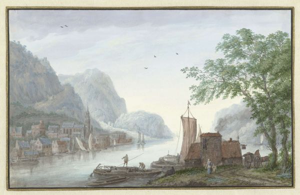 Editor: This is Abraham Rademaker's "Ancient Grave Ruins in a River Landscape," from around 1695 to 1700. It's a drawing made with watercolor, and it creates this really melancholic, almost theatrical scene. What do you see in this piece, beyond the initial picturesque view? Curator: It’s tempting to just see ruins and romanticize the past, isn’t it? But let’s consider the context: Rademaker was part of a Dutch Golden Age grappling with its own identity, its colonial legacy, and its place within Europe. These ruins aren't just aesthetic objects. How might they speak to anxieties around power and decline, especially as the Dutch Republic was reaching its peak? Editor: So, not just a pretty picture then... It is interesting how the figures are small, almost dwarfed, by the scale of the ruins. Curator: Precisely. That dynamic of scale contributes to the questions of power, of history. The ruins serve as a visual reminder of the temporary nature of empires. Think about who had the privilege of commissioning and consuming such images during Rademaker's time. And how does that intersect with contemporary discussions about monuments and contested histories? Editor: I see what you mean. It’s like Rademaker is inviting a dialogue between past grandeur and present-day power structures, using the landscape as a stage. Curator: Exactly! By showing these grand structures decaying, it subtly critiques the very notion of permanent dominance. What do we inherit when we inherit such perspectives? How does seeing these ruins, then and now, invite a conversation around the transient nature of authority itself? Editor: Wow, I definitely hadn't considered the socio-political implications before. I was just thinking about it as a landscape. Now, I understand there are other narratives in the play too. Curator: That’s the exciting part about engaging with art history – realizing the conversation never really ends, it evolves!