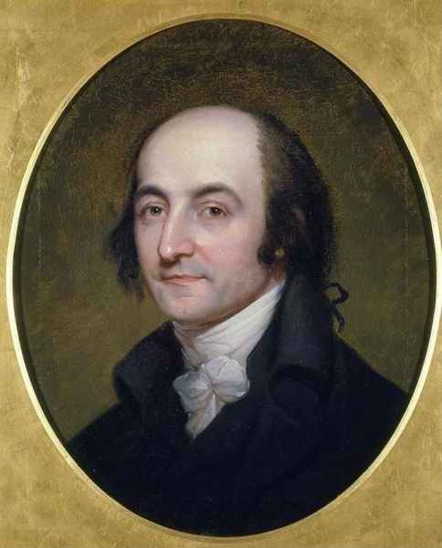 Curator: Looking at Gilbert Stuart’s "Albert Gallatin," circa 1803, the subject’s gaze and rather severe attire immediately create an impression of seriousness. What do you think? Editor: My initial impression is somber. The red background deepens the shadow, doesn't it? The subdued palette certainly reflects a conservative, neoclassical restraint, almost severe in its formality. How was this effect achieved with the materials? Curator: Indeed, Stuart’s oil paint application appears quite deliberate, building depth in the fabric of the jacket through subtle layering and glazing. Notice also how the raw canvas might peek through thin areas adding depth to the red backdrop? Editor: Fascinating, this calculated frugality extends beyond the paint, doesn't it? How much does it cost for clothing, even back then? His hands hold papers as he would be ready for work. It’s a stark image; a powerful person projecting modesty through skillful manipulation of materials. The linen paper he's holding feels as important as his ruffled jabot. Curator: Absolutely. Structurally, the composition follows the neoclassical emphasis on clarity and order; there’s a palpable sense of balance. Gallatin’s pose directs our eyes to his face. Editor: A portrait designed, one could say, to communicate power not through opulent display, but through controlled representation and a craftsman's knowing eye for surface and texture. One wonders if Gallatin knew he was becoming a propaganda tool, almost. Curator: Ultimately, it serves as a powerful depiction that offers not just an individual likeness, but insight into the values of an era. Editor: It definitely opens a deeper understanding of both its sitter and the modes of making that underpinned the formation of America’s visual culture. Thanks.