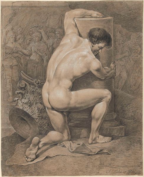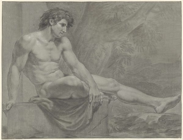 Editor: Here we have Pompeo Batoni's "Vulcan in His Forge," painted around 1750. What strikes me immediately is the intense focus in Vulcan's gaze, even amidst the heat of the forge. What do you see in this piece? Curator: Beyond the immediate drama, I see a commentary on labor, class, and even masculinity within the context of 18th-century social structures. Vulcan, a god, is relegated to the role of craftsman, perpetually toiling. His powerful physique becomes an emblem of forced labor, not divine strength. Do you think Batoni is glorifying him or questioning his position? Editor: That's a compelling point. I initially saw his physique as heroic, but framed that way, it speaks to a more complicated narrative of enforced servitude, of being bound to labor regardless of inherent power or status. Curator: Exactly. Think about who would have commissioned such a piece. Likely someone from the aristocracy, perhaps even engaging in their own kind of "labor" managing vast estates and extracting wealth from others' toil. There's a real power dynamic at play. How does the dark, almost claustrophobic background contribute, in your opinion? Editor: It heightens the sense of confinement, doesn’t it? The forge becomes a prison, not a place of creation. This piece challenges any romanticized notion of labor by emphasizing its oppressive qualities. Curator: Absolutely. And that reading opens up interesting avenues for thinking about class and power not just in the 18th century, but even now. Editor: I'll definitely view this differently now. It's much more than just a mythological scene; it's a statement about societal structure.