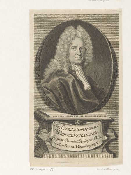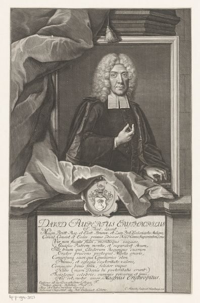 Editor: So, this is a print from 1714 by Martin Bernigeroth titled "Portret van Hans Caspar Graf von Lesgewang." It's an engraving, giving it such fine detail. There’s almost a somber quality to the portrait, despite all the frills. What do you make of it? Curator: What strikes me immediately is how this portrait operates within the visual language of power and status in the Baroque era. It's not just a likeness; it's a carefully constructed image designed to project a particular socio-political message. Consider the inclusion of his titles, Hans Caspar Graf von Lesgewang. Why is that so important to declare so clearly? Editor: Well, it seems pretty standard for portraits of the time. It's basically showing how important the subject is. Curator: Exactly. These details are important indicators of social standing during the period. He isn't merely a man; he is positioned as someone embedded in the mechanisms of governance and courtly life, also by presenting him within the Baroque visual vocabulary, how the staging with curtains becomes a codified form to legitimize the aristocratic class through images like this. Editor: So it’s less about *him* as a person, and more about what he represents? Curator: Precisely. Think about the role prints played in disseminating such imagery. This wasn't a unique painting accessible only to a few. This was an easily reproducible image designed for circulation, to make status very visible through multiple channels. Editor: That's a great point about the medium of printmaking being a factor in understanding how art functions as a social and political tool. It makes me rethink how portraits work. Curator: Right. And how the mechanics of image production intersect with societal structures to uphold particular power dynamics. Thinking critically about the “why” and “how” really open up new layers of interpretation, right? Editor: Definitely. I’ll be paying much more attention to these social dynamics when I look at portraits from now on.