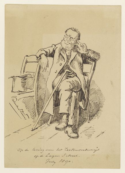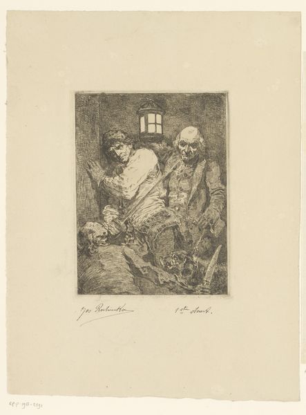 Editor: Here we have Jos Ratinckx's "Oude man gezeten op een kruk met pan en vork," or "Old man seated on a stool with pan and fork," an etching from 1888. I find the detail in this portrait striking; the artist really captured a weariness in the man's posture. What strikes you most about this image? Curator: Well, immediately I see the intersection of realism and genre-painting. It begs the question: Who was this man? Was he a specific person that Ratinckx encountered and sought to depict with accuracy? Or, did this figure represent a broader segment of society that Ratinckx was hoping to portray for the public? Editor: That's interesting, I hadn't thought about the "public" aspect of this kind of artwork. Curator: Consider the medium - an etching, reproduced and distributed. And the date – 1888. Think about the burgeoning social awareness of the period, movements towards labor rights, increased urban poverty… How might this image participate in a conversation around these topics? What do the pan and fork tell us? Editor: I guess it implies a sort of humble, working-class existence. The pitcher on the floor supports that reading too, maybe he's about to eat or has just finished. It makes you think about daily life. Curator: Exactly. Now, how might a genre-painting like this influence public opinion? Or reflect the social consciousness of its time? Does it idealize the man, or does it aim to represent the grim realities of poverty? And how does Ratinckx position himself as an artist in relation to his subject? Editor: I hadn't considered how an image like this might shape someone's perspective of working-class people during that time. I suppose it invites a certain level of social critique. Curator: Precisely. Thinking about this piece within the context of art as a social commentary certainly enriches my understanding of it. Editor: Mine too. Seeing it as a form of social discourse rather than just a portrait adds a whole new dimension to its impact.
