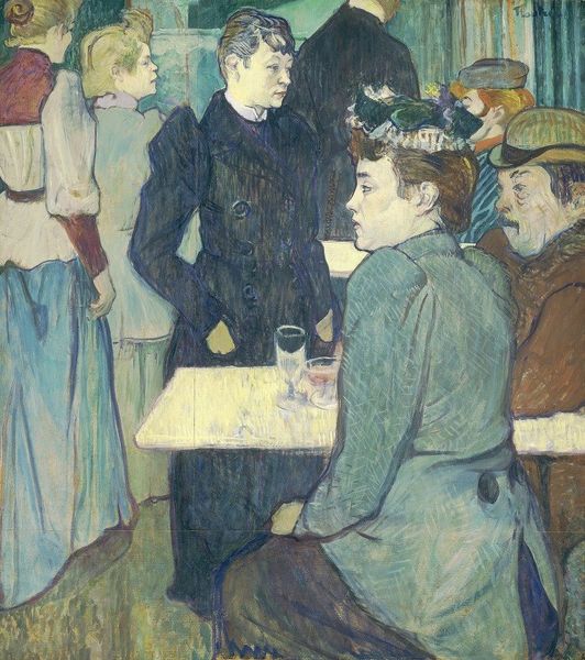 Curator: This is Henri de Toulouse-Lautrec's "Moulin de la Galette", created around 1889. It's an oil painting rendered with impasto on cardboard. Editor: There's an unsettling feeling here, despite the implied merriment. The people seem strangely isolated, almost spectral, as though trapped in amber. Curator: The impasto certainly contributes to that feeling of transience; look at how the thickly applied paint creates depth. It pushes figures forward while blurring the background—isolating them, as you said. Editor: Exactly, but beyond technique, the Moulin itself was a site loaded with cultural significance, a place for all classes to mix during a time of social change. Curator: True. And Lautrec emphasizes a strong diagonal that guides the composition. Starting from the lower right with the foreground table, then ascending toward the implied stage. Notice how most of the figures, especially those on the right, wear darker colors than those on the dance floor. The implied audience in the foreground are literally and figuratively detached. Editor: Absolutely, they seem almost voyeuristic. Lautrec, as a nobleman who frequented such places, portrays the disjunction. Red hair in this period was often a marker for women from the margins. Those details aren't accidental. What do the white plates symbolize, do you suppose? Is it innocence lost? Curator: Those plates present an intriguing semiotic rupture, indeed! Their sterile gleam calls stark attention to the otherwise dissolving forms of the crowd, becoming almost allegorical through the color. Editor: It’s difficult to disentangle Lautrec’s biographical experience from his choices here, as the red hair indicates marginal identities. This painting embodies not just a place, but a feeling, doesn’t it? Curator: Precisely. Beyond documentation, it is his highly individualized and expressive hand that remains indelible. Editor: A vital convergence: Lautrec's technical prowess channeling such rich social textures through deeply human feeling.