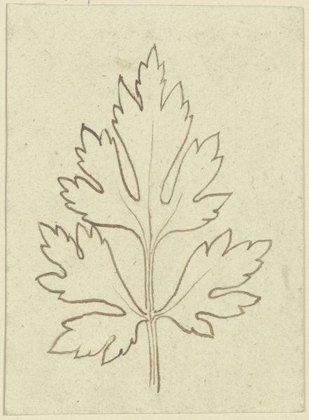 Editor: This is a drawing titled "Leaf" by Karl Ballenberger. It's an ink drawing on paper from the 19th century. There's a delicate quality to the line work, almost scientific. It makes me wonder what its purpose was. How do you interpret this work? Curator: It’s tempting to see this as a straightforward botanical study, but considering the period, it's worth thinking about its place within wider visual culture. Were drawings like this purely for scientific documentation, or did they also contribute to emerging aesthetic tastes and design motifs of the time? Think of the rising popularity of botanical illustration, impacting wallpaper design, textile patterns, even jewelry. Was Ballenberger influenced by and contributing to these trends? Editor: That’s a good point. So you’re saying it might have been intended for more than just scientific accuracy, potentially as inspiration for decorative arts? Curator: Precisely. Who was commissioning or purchasing drawings like these, and how were they used and displayed? These kinds of images often helped reinforce and circulate specific understandings about nature itself, which at the time could be linked to ideas about national identity, or even colonial exploitation of resources. The simplicity can be deceiving. Editor: It's interesting to think about a simple leaf carrying all these different meanings and purposes! Curator: Exactly! By examining the social context surrounding this “Leaf,” we move beyond mere identification to understand its role in shaping cultural values. What appears to be an isolated drawing participates in a larger network of images and ideas. Editor: I never thought of it that way, it adds so much depth. I appreciate how you connect it to the social forces at play in that period.
