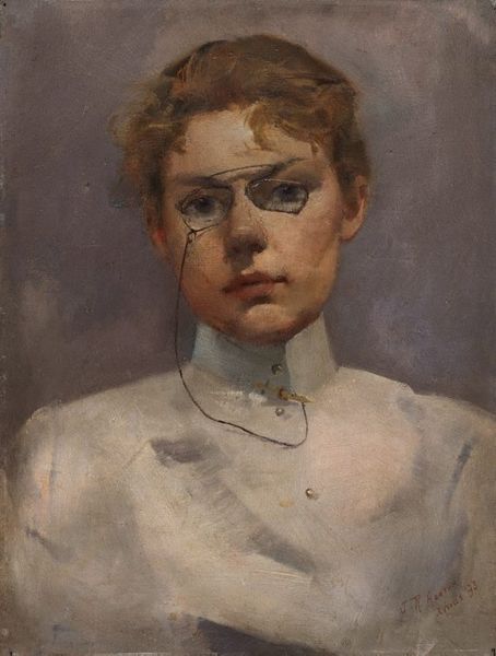 Curator: Before us is Zinaida Serebriakova’s "Portrait of a young Woman", painted in 1915. Serebriakova was a fascinating figure working at a time when artistic styles were rapidly shifting, and her portraits often capture a certain intimacy and quiet strength. Editor: She really does exude both intimacy and strength. Something about her clear gaze, the almost unsettling clarity of it… I feel immediately drawn in, yet also strangely distanced. There is something reserved about her expression. Curator: Absolutely. Consider the symbolic weight of portraits, especially self-portraits, which this could well be. They function almost like personal icons, constructed to convey something about the subject, even reveal something about the era. She has this direct and somewhat challenging stare. It projects a self-assuredness that goes against societal expectations of women at the time. Editor: True, yet the colors and loose brushstrokes also give it a soft, almost dreamy quality, pulling the work back from becoming overtly defiant. It's interesting how the warm tones of her skin and the golden ochre of her clothing contrast so vividly with her bright blue eyes. That splash of cold blue really holds your gaze. And in my mind it underscores an emotional intelligence or an emotional distance perhaps. Curator: And notice how Serebriakova uses watercolor and oil paint in a way that feels modern, even impressionistic, and yet, the precise details in the face hark back to the traditions of academic portraiture. The image oscillates between realism and the kind of fleeting representation we find in Impressionism. It's a striking mix. There's a timeless quality, too, isn't there? Editor: Very true. The muted color palette feels simultaneously contemporary and nostalgic. As a viewer I imagine a glimpse into the past while appreciating its artistic freshness. The overall effect isn’t dated; rather, it seems to bypass specific temporal constraints altogether. She is able to be, well, like every person that way, outside of a historical context in some regards. It makes the whole viewing experience feel surprisingly personal. Curator: Indeed. Her unique way of embedding complex cultural and psychological meaning into something that seems straightforward or a mere depiction elevates this work above conventional portraiture. I really believe this portrait demonstrates not only technical brilliance but also insight into human psychology. Editor: Yes. For me, encountering a piece like this feels like more than viewing a painting; it is meeting a person, a woman, separated by time yet still vibrantly present.