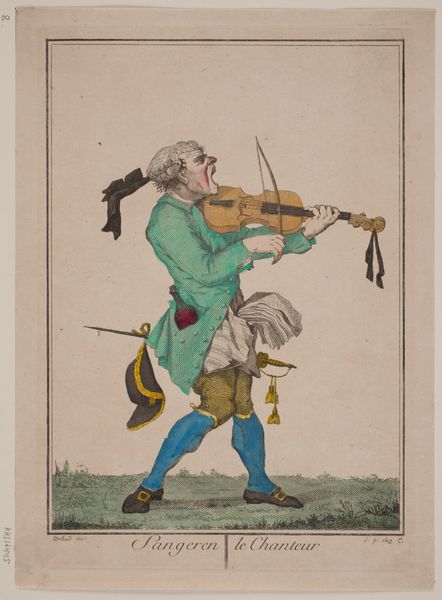 This is Henry William Bunbury’s “Concerto Spirituale,” a colored etching created in the late 18th century. The composition is immediately striking for its use of caricature. Notice how Bunbury exaggerates the features of the musicians, distorting their faces and bodies. This deliberate distortion isn't just for comic effect; it challenges classical ideals of beauty, disrupting established aesthetic norms and hinting at underlying social critiques. The use of line and color is also interesting. The delicate, almost fragile lines define the figures and instruments, while the subdued palette creates a sense of intimacy and quiet satire. The arrangement of the figures, crammed into a small space, further enhances the sense of disruption, contrasting with the harmonious ideals often associated with musical performance. Consider how the title, "Concerto Spirituale," ironically plays against the visual absurdity of the scene. The artwork prompts questions about the relationship between art, representation, and social commentary. This piece remains an open invitation to challenge and expand our understanding.