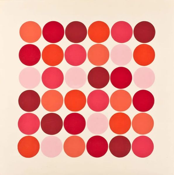 Editor: This is an "Untitled" piece by Thomas Downing, from 1965. It looks like acrylic on canvas, arranged in a diamond grid. It feels quite simple, but I am also drawn to the use of circles of differing colors among mostly uniform reds. How would you interpret this work? Curator: We can understand this piece through the pure visual relationships presented. Let’s consider the shape itself; the lozenge. How does its geometry interact with the arrangement of the circles? Editor: Well, the circles seem uniformly distributed within the shape, almost regardless of the borders...except where color shifts and disrupts it. Curator: Precisely. Now observe the palette: a careful arrangement of chromatic intensities, each circle a discrete unit, yet unified by repetition and relative color warmth. Note the tension between the flat surface and the suggestion of depth created by the color variations. How do you read those disruptions to the visual pattern? Editor: I initially viewed the other colors as being 'wrong' when the vast majority are different shades of red, as if they disrupt an anticipated design, which forces me to focus on those points within the greater composition. Curator: Exactly. The artist engages with the pictorial surface, calling attention to its inherent qualities rather than representing external realities. It invites a visual experience divorced from narrative or symbolism, focusing purely on form and color. Editor: I never considered the pure visual relationships it presents! It feels like this new view frees it from needing to mean anything, and I can now appreciate how all the artistic elements combine to present such unique work. Curator: Indeed; it offers a space for aesthetic contemplation based upon fundamental, concrete forms.