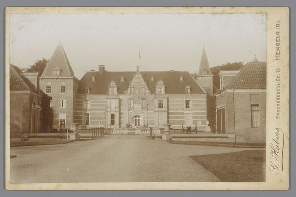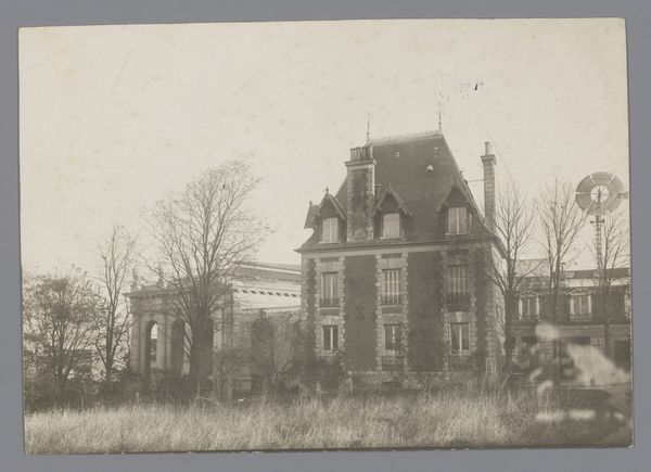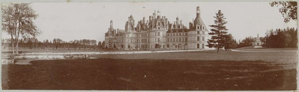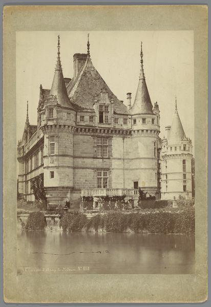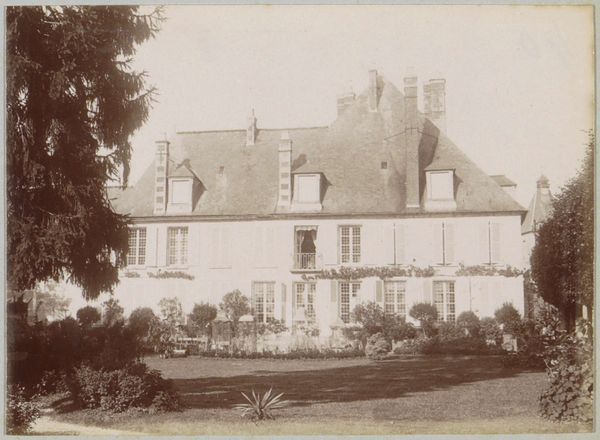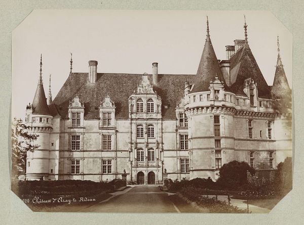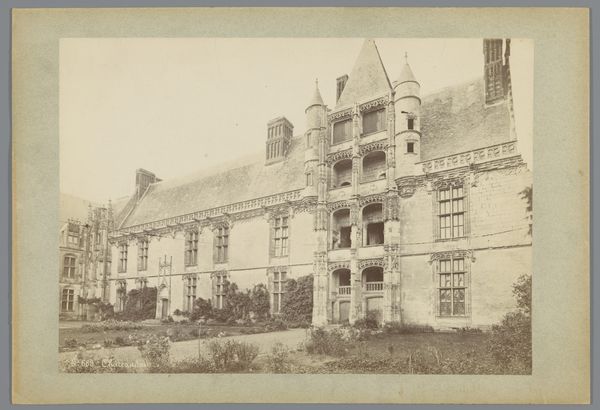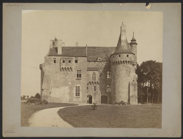 Curator: Edmond Bacot’s photograph, Château de Martainville, dating from 1852-1854, is presently housed at the Metropolitan Museum of Art. Editor: It exudes a feeling of wistful melancholy. The sepia tones and soft focus render it almost dreamlike, or like a faded memory of old Europe. Curator: The composition certainly commands attention. Note how the convergence of lines guides the eye upward to the varied roofline, culminating in a cluster of turrets and chimneys, which project against the subtle gradations of the sky. The texture of the stone is remarkably captured given the early photographic process. Editor: Yes, and chateaux always conjure archetypal associations – romantic ideals of courtly love, tales of hidden rooms and long-lost secrets. The towers especially reference something almost fairytale-like, even Rapunzel or Sleeping Beauty waiting in their tower. Curator: The visual weight seems to balance perfectly. Despite the imposing architectural elements, there's an equilibrium in the arrangement, preventing it from appearing top-heavy or asymmetrical, achieved largely through framing from the eye level ground plane that mirrors in reverse the sky's tonality. Editor: It’s not just any fairytale; this recalls ones infused with somber undertones. It reminds me of abandoned ancestral homes, places marked by histories of glory and decline. Even in its static form, I perceive it narrating something deeper. Curator: Perhaps this feeling you are noting comes from the way Bacot plays with the limitations of the photographic technology itself; by leaning into them he underscores a unique stillness within this visual study. The sharp corners and gradations of light direct our attention to essential geometric forms within the scene. Editor: Perhaps. For me the enduring fascination stems from these windows. The building almost becomes a human figure gazing back at us, inviting projections of its inhabitants. It invites us to ponder the cycles of history. Curator: Ultimately, this photograph offers a fascinating study in contrasts. The architecture against its environment shows, and the softness versus sharp lines generates visual and cognitive dynamism. Editor: A powerful reminder that places hold memories and speak to our shared human experiences of both triumph and tragedy.