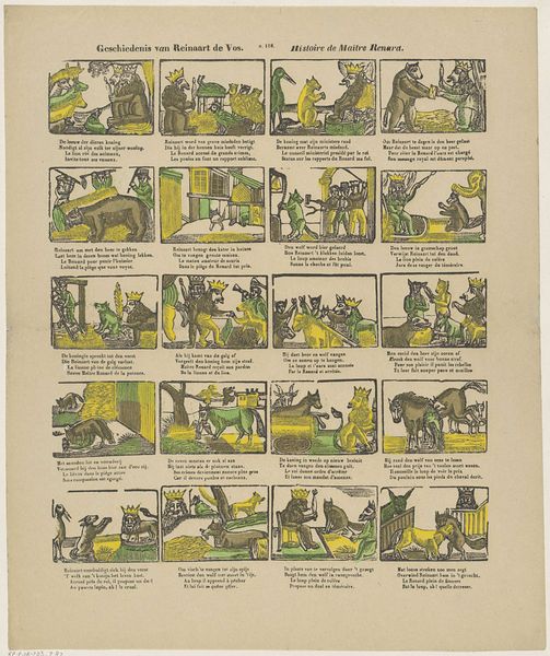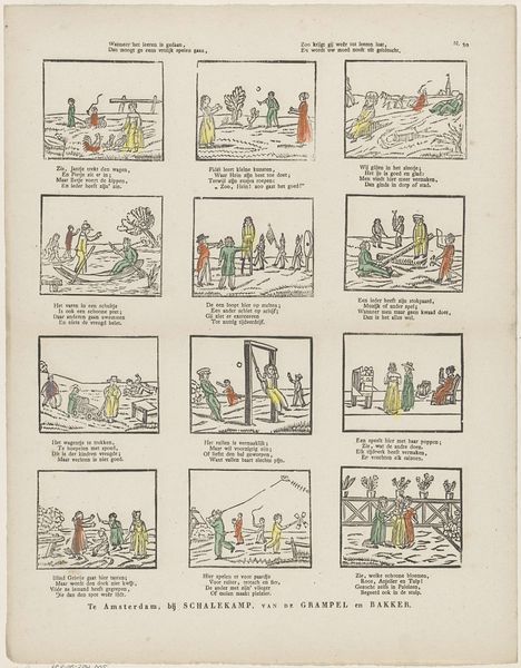 Franciscus Antonius Beersmans created this print, "Les bons enfans / De lieve kinderen," using a now somewhat antiquated printing method. The print’s appearance reflects the directness of the printing process. The lines are bold, and the colors are applied flatly within the outlines. The relatively low level of detail suggests that this was made with a process designed for speed and efficiency, prioritizing production volume over fine detail. Prints like these had considerable social significance at the time. They brought images and stories into homes that wouldn't have had access to original paintings or other artworks. This availability democratized art consumption, and allowed for the widespread dissemination of cultural values and moral lessons, like those depicted here. By understanding the materials and making behind this print, we can recognize its role in broader social and cultural shifts. It highlights the importance of considering the means of production when interpreting any work of art.