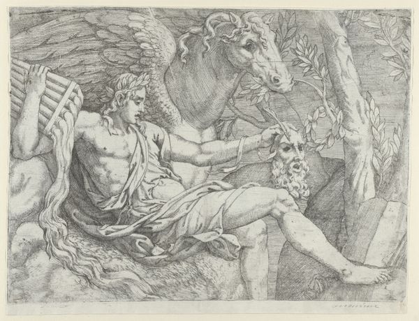 Editor: This engraving, “Naked Man Pursuing a Naiad,” was created between 1510 and 1520 by Marco Dente as part of the "Speculum Romanae Magnificentiae" series. The male figure has such intense energy, while the Naiad appears almost indifferent to his pursuit. How do you interpret this work, particularly in its historical context? Curator: It's interesting you point out the contrast. We can consider this work as part of the Renaissance fascination with classical antiquity and its revival of certain values. But let’s look deeper. The male figure, seemingly a representation of virility and power, pursues the nymph, embodying a perhaps idealized but still subjugated feminine figure. Consider the socio-political climate: powerful men often depicted chasing elusive female figures – is this about a literal pursuit, or is there something else at stake here? How do you see the figure of Cupid here playing into that dynamic? Editor: That’s a good question! Cupid seems to be almost propelling the Naiad *away* from the man rather than inciting attraction, so I wonder if there is something deeper happening than just the chase, perhaps some critique? Curator: Exactly. Viewing this through a feminist lens, one can see a potential subversion of power. The naiad isn't resisting, but neither is she inviting the pursuit. She’s present and composed, in her element, independent. Perhaps Dente is suggesting a questioning of male dominance rather than celebrating it. What implications could a print like this have had circulating at that time? Editor: That makes so much sense when you put it in that framework. I was initially reacting to it simply on a surface level, but situating the piece historically like this adds so many interesting dimensions to it! Curator: It allows us to read against the grain, challenging dominant narratives even within seemingly straightforward depictions. Editor: Definitely gives me a lot to think about. Thanks for opening my eyes to this!